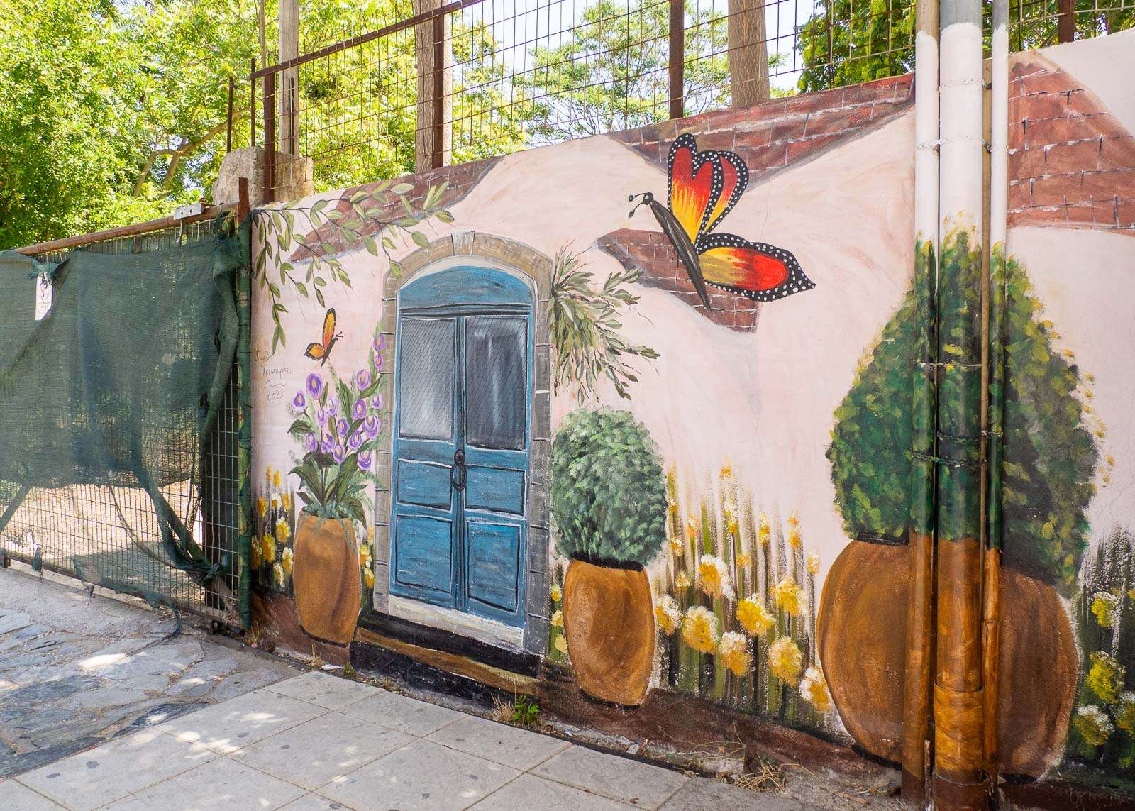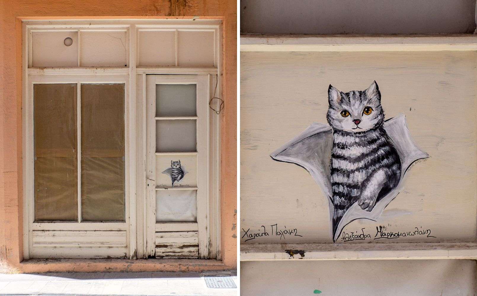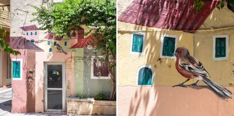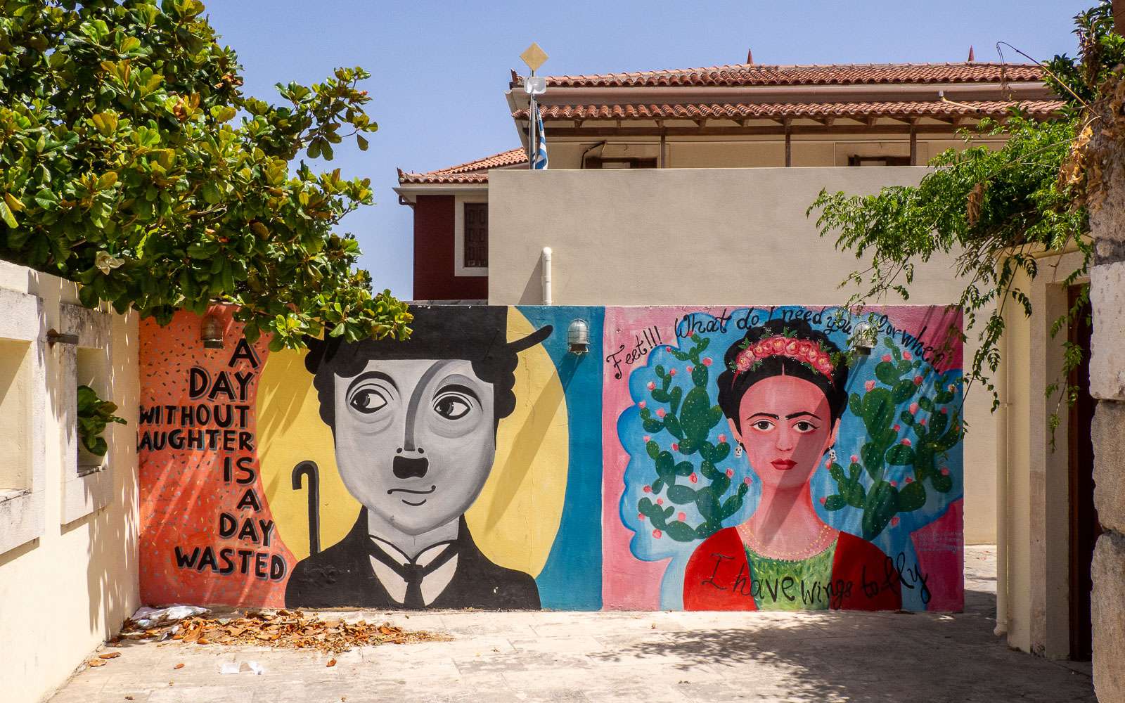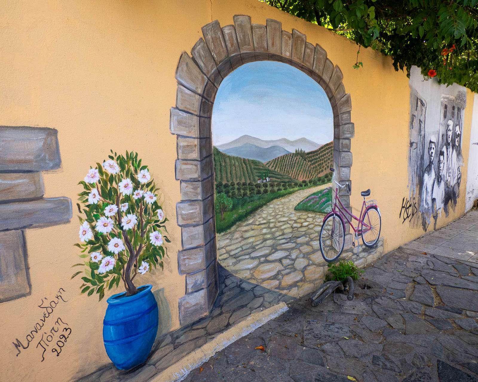 Mutta, skipataan siis ruoka, juoma ja patikointipolut ja keskitytään katutaiteeseen! Värikkäät työt kertovat tarinoita kylän arjesta, luonnosta ja Kreikan mytologiasta.