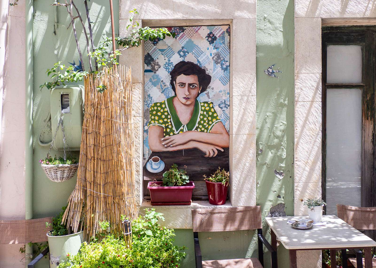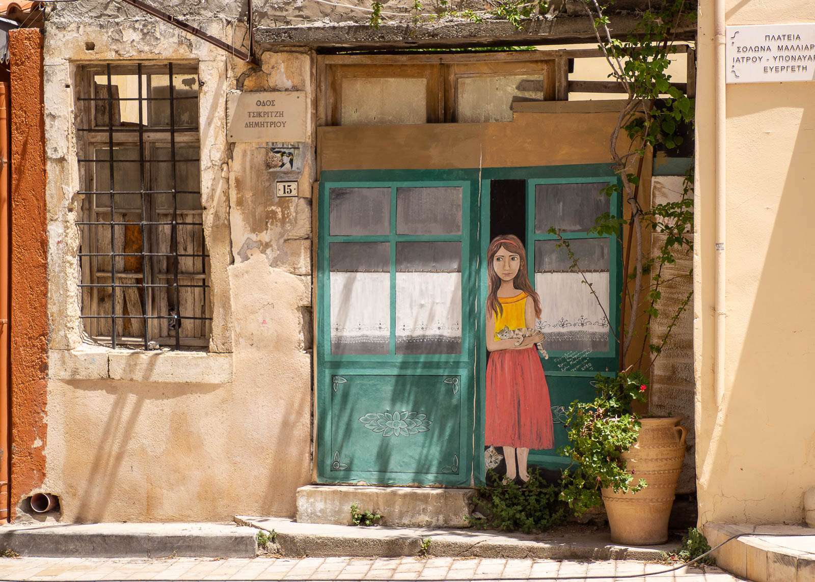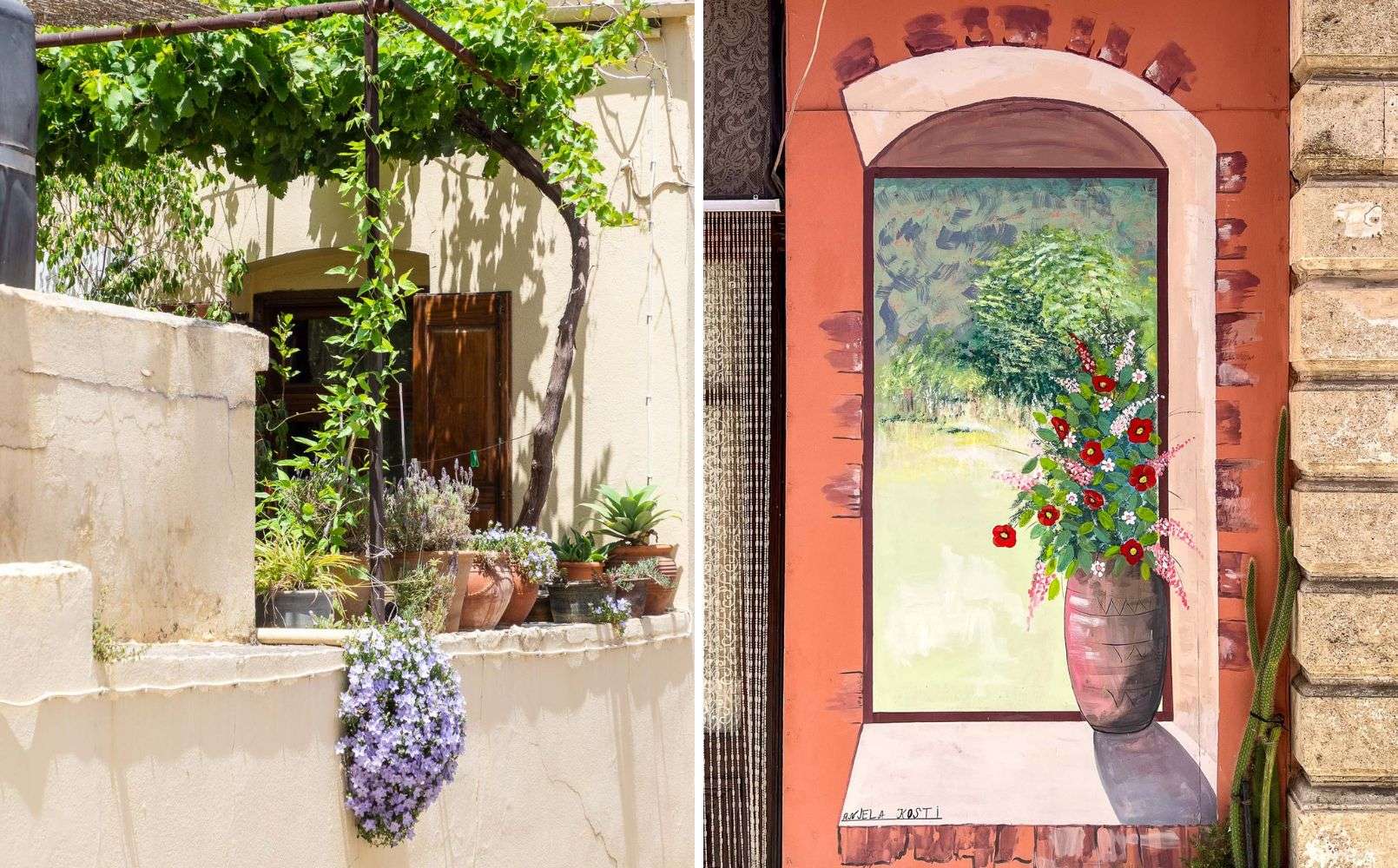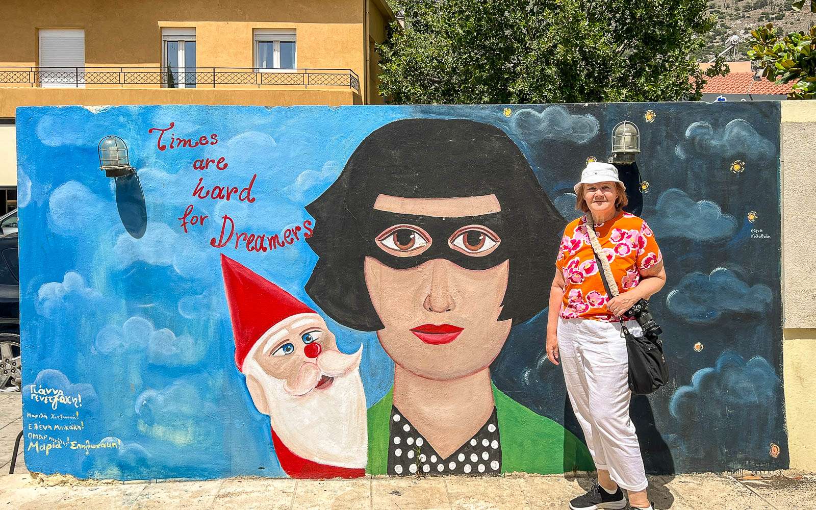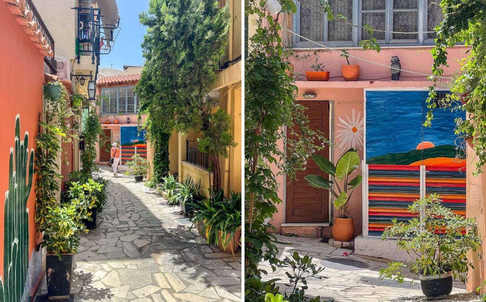 Mutta, skipataan siis ruoka, juoma ja patikointipolut ja keskitytään katutaiteeseen! Värikkäät työt kertovat tarinoita kylän arjesta, luonnosta ja Kreikan mytologiasta.