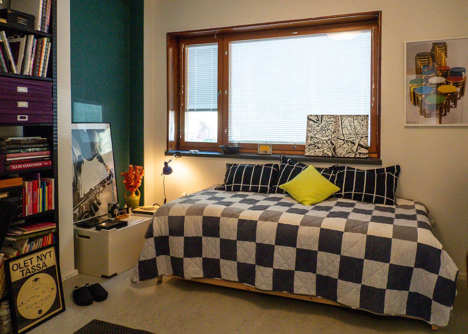 “Kiersimme tänään tusinan verran, ainakin, Sunilan asuntoja, mutta Harrin asunnolle ei kyllä mikään niistä vetänyt vertaa – ei haitannut yhtään, että siellä ei tainnut olla yhtään ainutta Aalto-huonekalua tai -valaisinta – sen sijaan siellä oli koko maailma!”