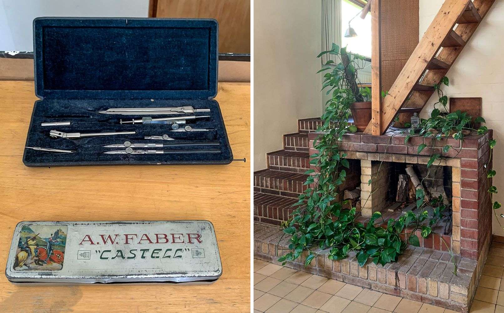 Työkalut pysäyttivät, sillä harpit ja tuollainen kynälaatikko olivat meilläkin vielä opiskeluaikoina 60- ja 70-luvuilla käytössä. Talossa on useita takkoja, tämä rustiikki takka sijaitsee ateljeen nurkassa.
