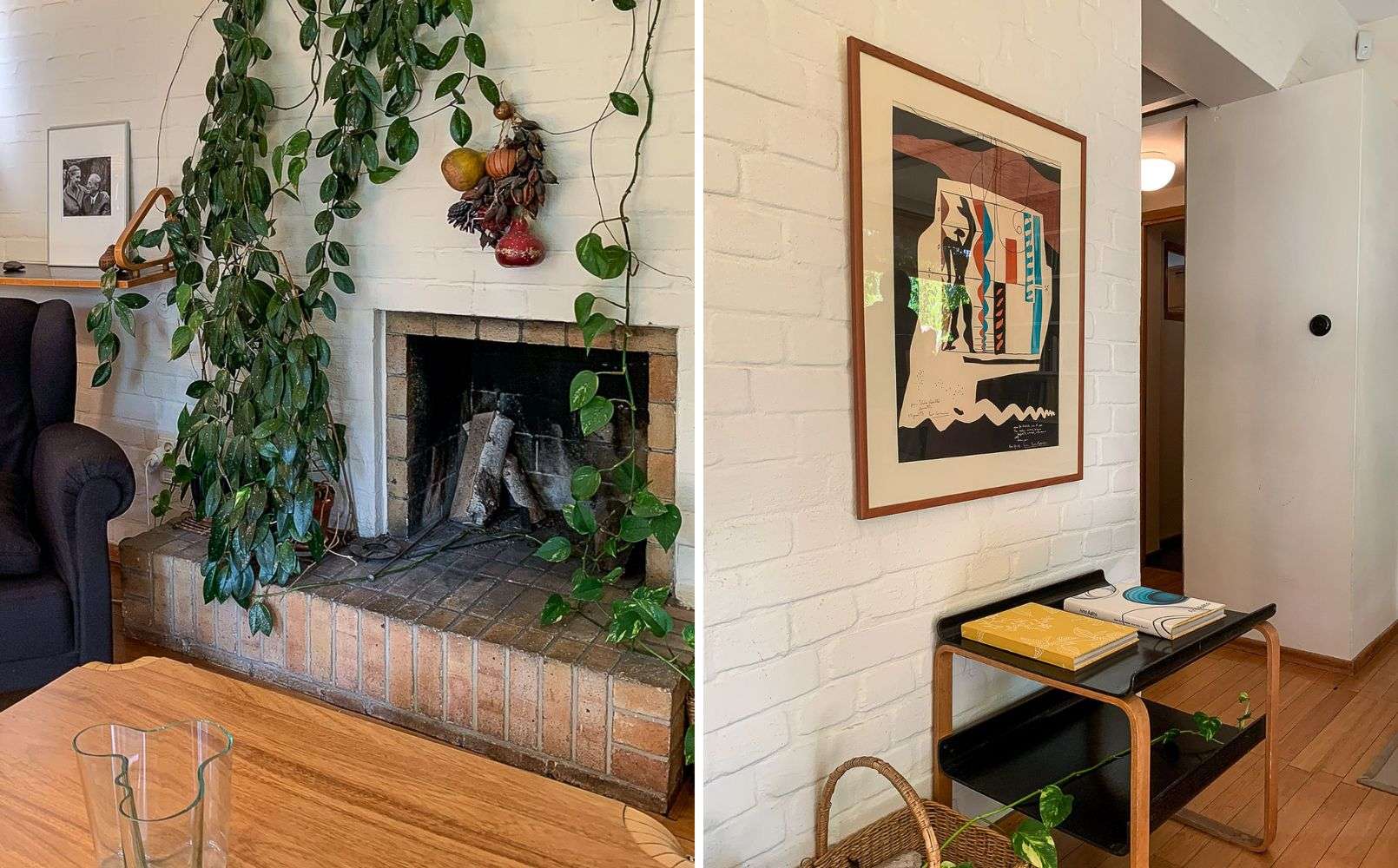 Talon toinen takka – pöydällä tietysti Aalto-maljakko, joita talossa on jostain syystä :-) useita. Oikealla ensimmäisiä esimerkkejä taivutetun puun käytöstä. Seinällä Le Corbusierin työ.Ruokailutila ja keittiö