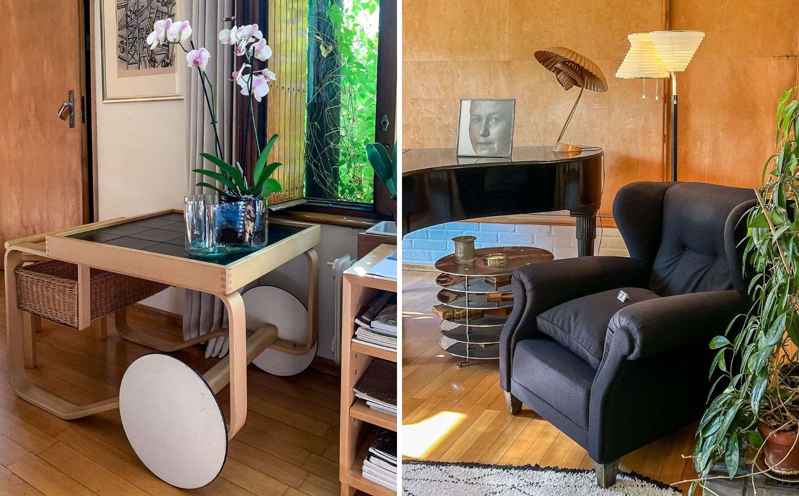 Artekin tarjoiluvaunun tuntevat kaikki. Vasemman kuvan metallinen tupakkapöytä sen sijaan jäi vain prototyypiksi. Enkelinsiipivalaisimessa on kolme osaa. Flyygelin päällä oleva valaisin on Poulsenin, ei Aaltojen suunnittelema.
