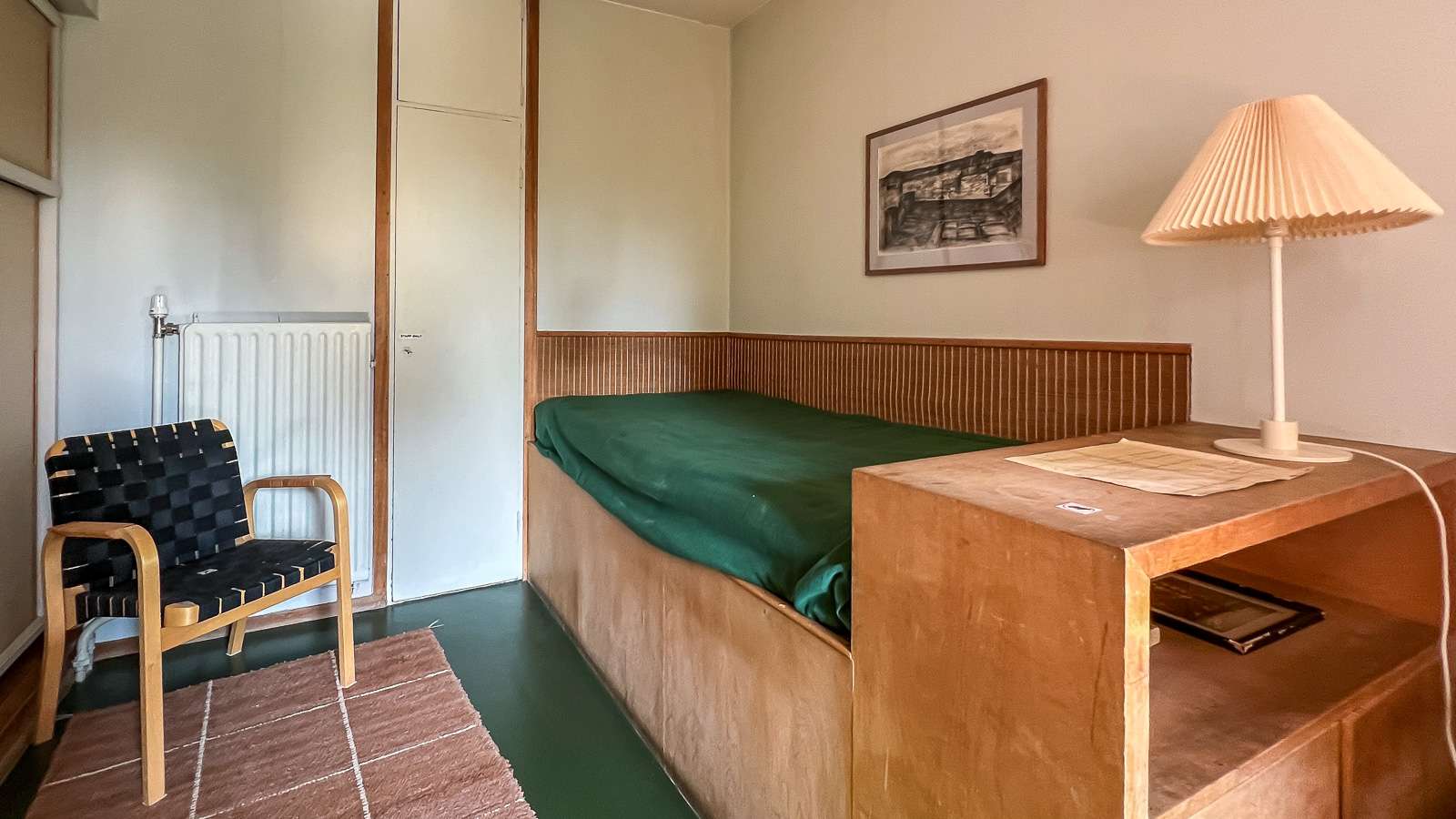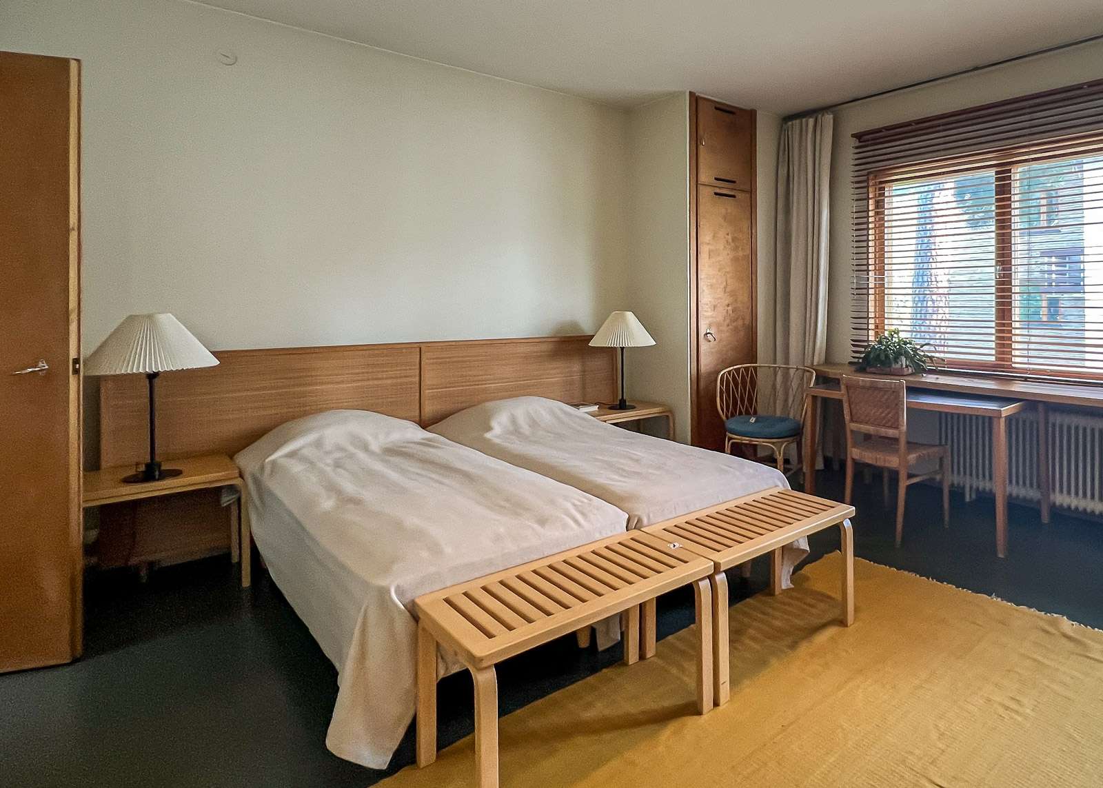 Makuuhuoneidenkin kalustus on luonnollisesti toteutettu pääosin Artekin kalusteilla ja tekstiileillä. Päämakuuhuoneen sänkyjen jalkopäässä olevat ritiläpenkit ovat omassakin makuuhuoneessamme, tosin valkoisina ja yöpöytinä.