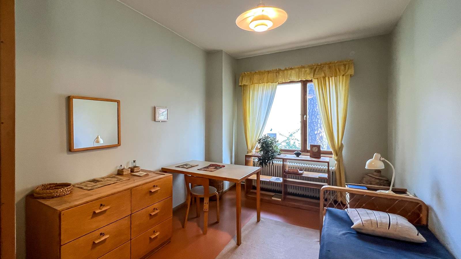 Huomaa lamppu ikkunan edessä. Alvar Aallon Ranskaan Maison Carréen suunniteltu valaisin vuodelta 1958. Hybridivalaisimen ”kylkiosan” valon voi suunnata esimerkiksi taideteokseen.