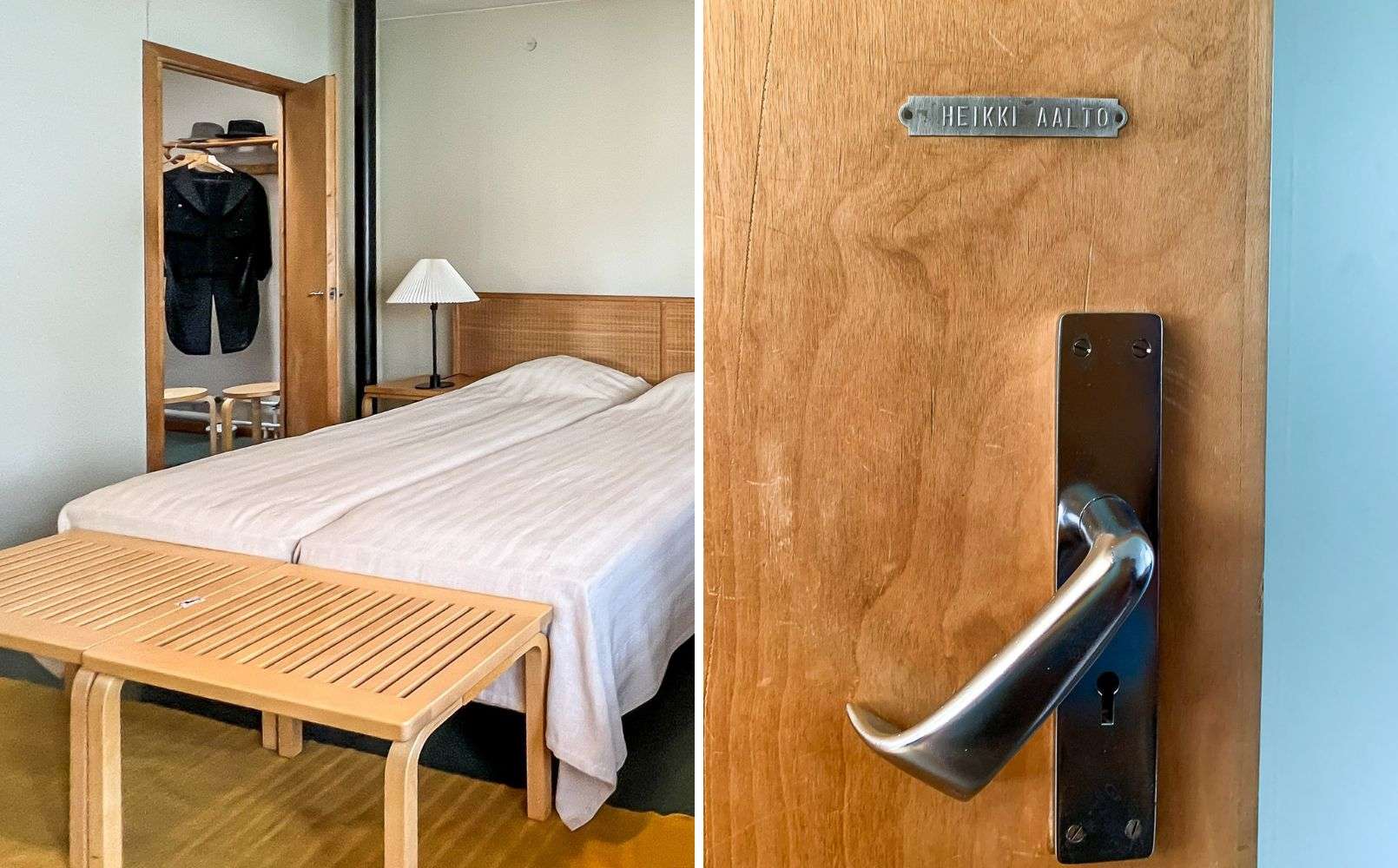 Alvar Aallon käyttämiä hattuja on riittänyt aika moneen Aalto-kohteeseen :-) Pojan huoneen ovessa alkuperäinen nimikilpi. Ovenkahvat on suunniteltu alunperin Paimion parantolaan – ne liikkuvat hyvin lähellä ovea, jotta lääkärin takin hihansuut eivät tarttuisi niihin ja olivat helposti avattavissa myös kyynärpäällä.