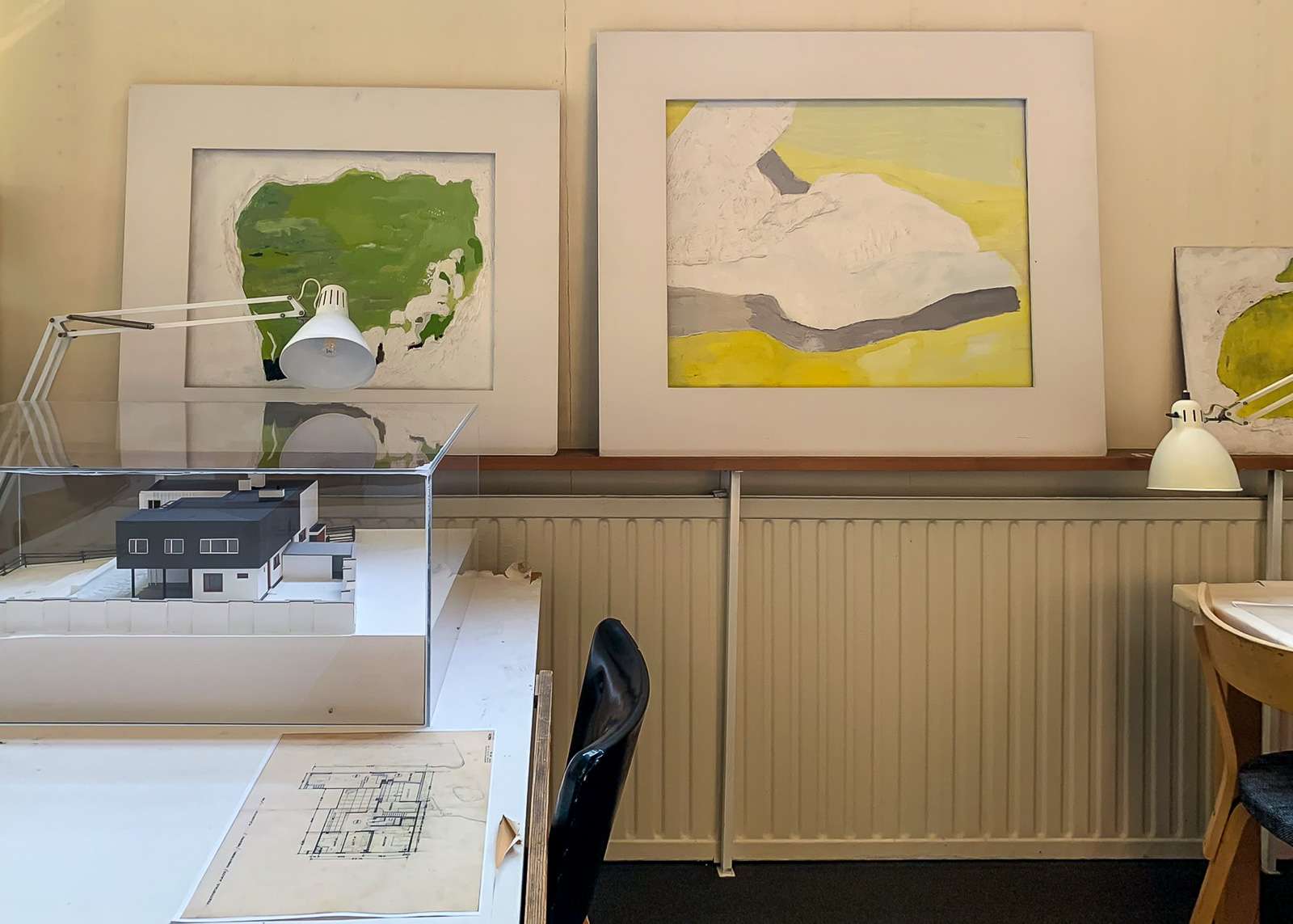 Maestron työpisteestä ateljeen nurkasta on avoimet näköalat kahteen suuntaan. Ennen tämän talon rakentamista Aallot olivat suunnitelleet Paimion parantolan, josta kuva ateljeen nurkassa