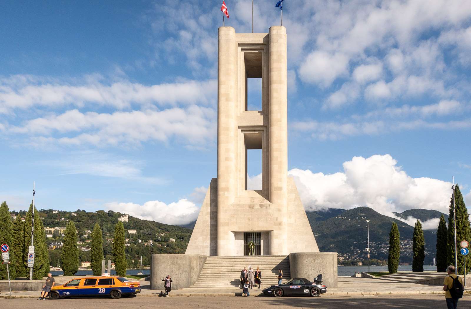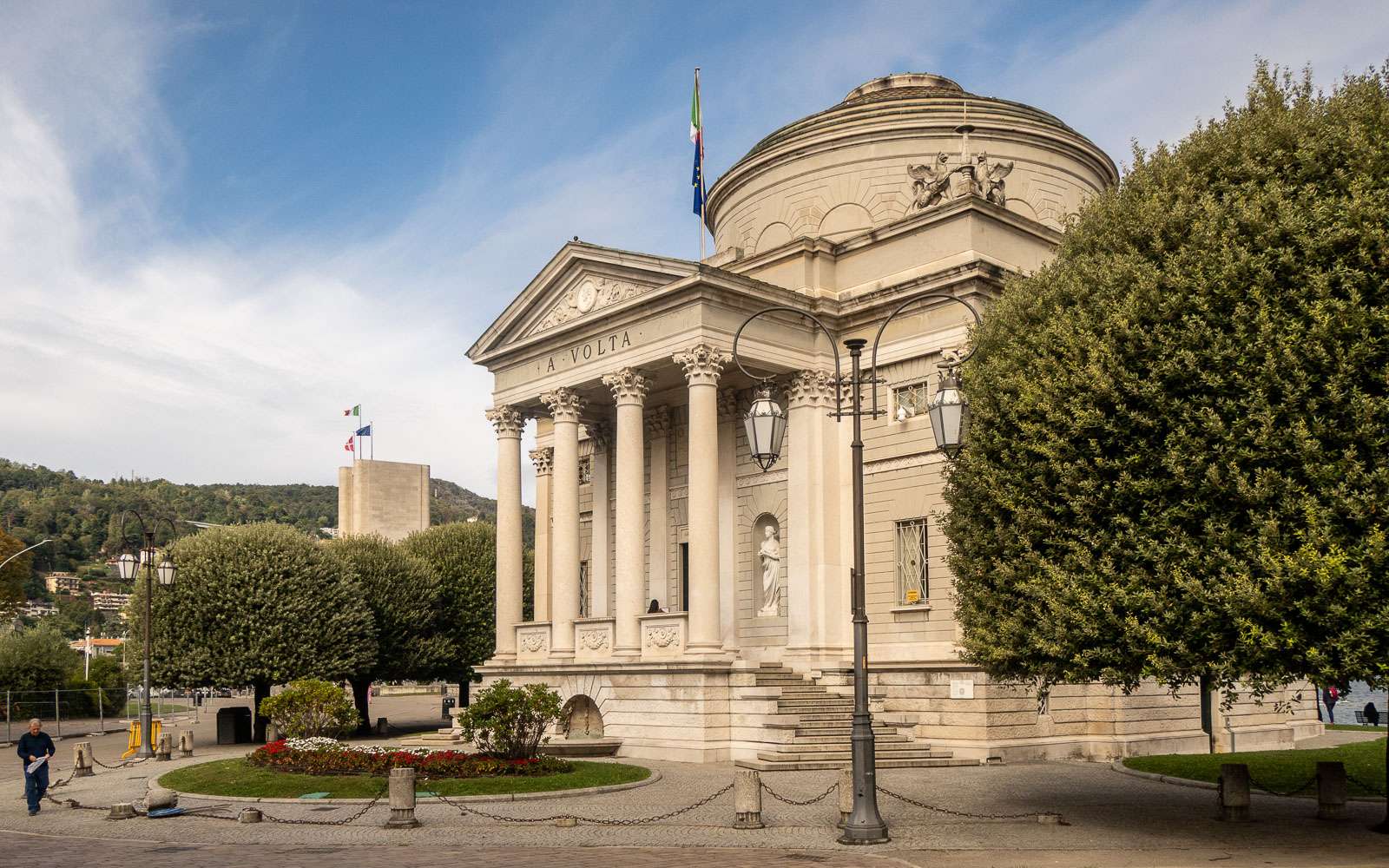 Ensimmäisenä aamuna ensimmäinen kohteemme oli, luonnollisesti, Como-järvi. Ihan järven rannalla on kolmekin monumenttia, joista Ai Caduti-monumentti ensimmäisen maailmansodan uhreille on järkyttävän ruma. Alessandro Voltalle omistettu Tempio Voltiano on sentään klassisen näköinen vaikkakin mahtavan kokoinen sekin. Alessandro Volta on Comon ylpeys, fyysikko, joka keksi sähköpariston. Museon lisäksi aivan kaupungin keskustassa on Voltan patsas. Life Eletric -patsas ja sille vievä laituri edustavat kevyempää, modernimpaa (ja kauniimpaa) arkkitehtuuria.