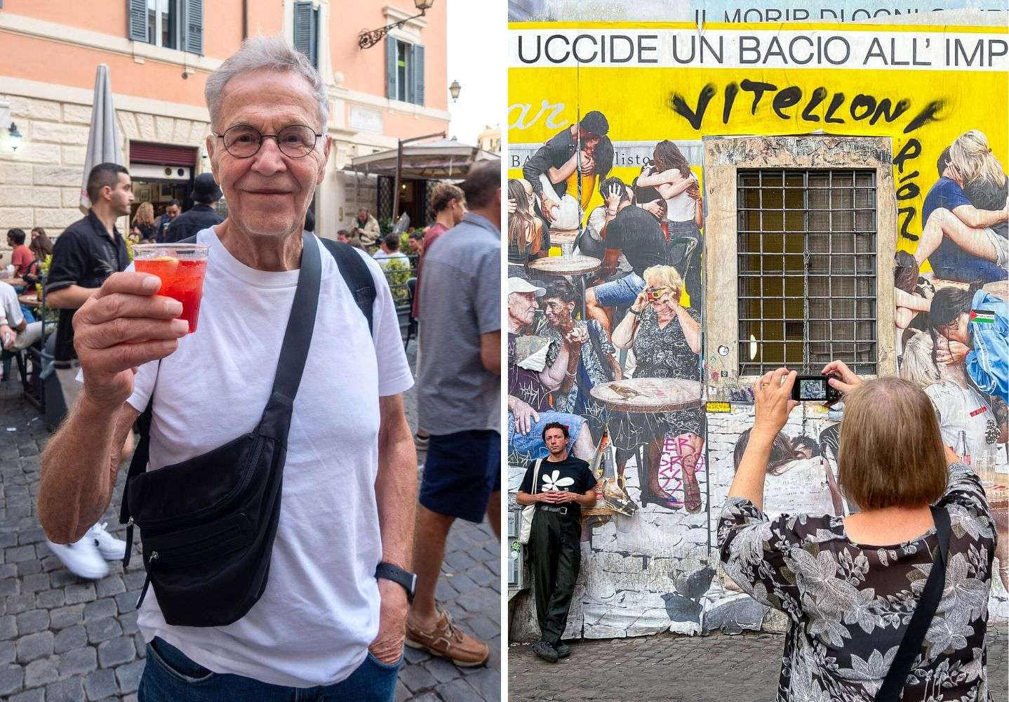 Syöminen – tai tässä tapauksessa juominen – jatkui seuraavassakin pisteessä. Kuulemma Trasteveren suosituimman baarin edustalla nautimme spritzerit. Kuulemma kun paikalliset sopivat tapaavansa Trasteveressä, baarissa, niin he tarkoittavat tätä Bar San Calistoa, ja tätä aukiota Santa Maria in Trastevere -kirkon edustalla. Mekin päädyimme tapaamaan täällä, emme paikallisia, vaan suomalaisia Maailmanmatkaaja-ystäviämme samaisella aukiolla! Tiesimme, että hekin ovat Roomassa osittain samoina päivinä kuin me, mutta emme sopineet tapaamista, sillä tuntui vähän hassulta viettää aikaa yhdessä Roomassa, kun tapaamme useita kertoja vuodessa Suomessa. Mutta niin vaan sattumalta osuimme saman iltana samalle aukiolle ja ehdimme vaihtaa kuulumiset ennen kuin oli aika jatkaa taas matkaa!