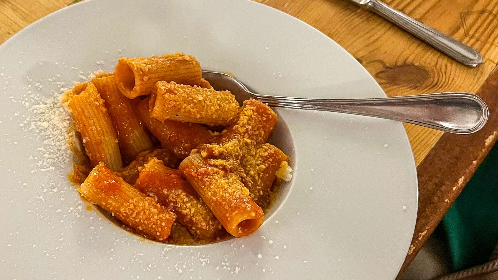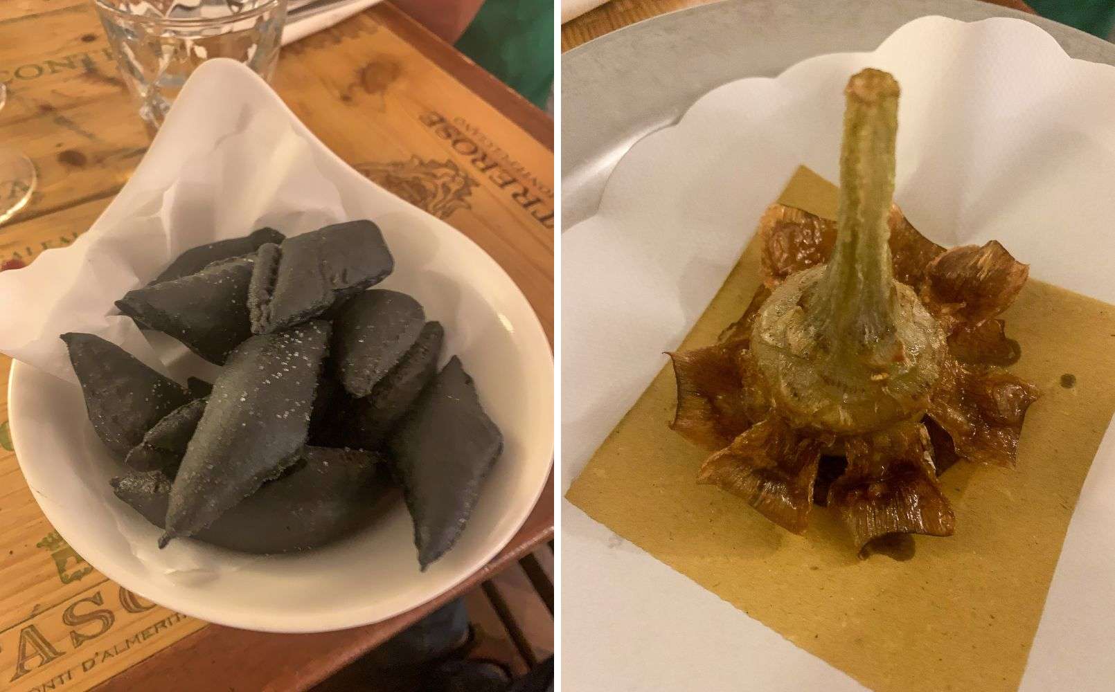 Pastaravintolaan – tämän roomalaiset olisivat kuulemma määritelleet osteriaksi – asetuttuamme aloitimme friteeratuilla artisokan kukilla ja pikimustalla leivällä. Kummatkin yllättäviä vaihtoehtoja, mutta myös yllättävän hyviä. Pastavaihtoehtoina oli kasvissyöjille klassinen cacio e pepe juustopasta ja muille myös hyvin tunnettu pasta all’amatriciana, jossa oli tomaattia ja possunposkea. Cacio e pepe -pastan valmistamisesta oli myös vähän puhetta, vaikka ainesosat siihen ovat vähäiset ja sellaisena voisi luulla pastan valmistamisen olevan yksinkertaista, niin kastikkeeseen käytettävän pastan keitinliemen ja juuston määrän suhde on tarkkaa, jotta kastikkeesta tulisi juuri sopivan paksua.