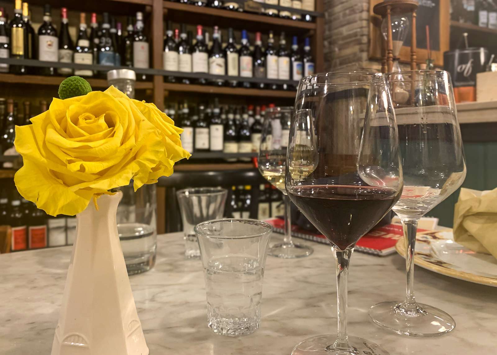 Ensimmäinen pysähdys oli enotekassa, jossa nautimme, luonnollisesti, viiniä, ja sen kanssa pientä purtavaa. Oppaamme ainakin välitti paikkaa sellaiseksi, jossa käy enemmän paikallisia kuin turisteja. Yhtenä perusteena, että paikka varsinaisesti avasi vasta klo 19, vaikka pieni n. kymmenen hengen ryhmämme pääsikin sinne jo klo 18. Alunperinhän enotekat ovat olleet paikkoja, joissa paikalliset viinintuottajat esittelivät ja myivät tuotteitaan, usein paikallisten juustojen, leikkeleiden ja muiden pienten herkkujen kera. Sittemmin tietysti tämäkin konsepti on levinnyt enemmän tai vähemmän ympäri maailmaa.