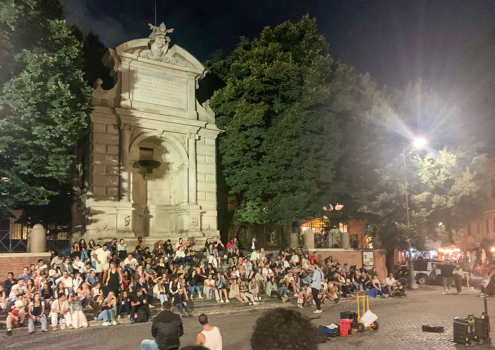 Trasteveressä on kai muutama nähtävyyskin, kun vaikka Santa Maria in Trastevere -kirkko, joka on yksi Rooman vanhimmista kirkoista. Pysähdyimme kyllä hetkeksi kirkon edustalle, mutta ruokaretkellämme emme sinne poikenneet. Alkuillasta monet ihmiset tapaavat toisiaan juuri kirkon edustan aukiolla. Toinen suosittu aukio on Piazza di Trilussa, Tiber-joen tuntumassa Ponte Sisto -sillan vieressä. Piazza di Trilussan suihkulähteelle mekin päätimme kierroksemme.