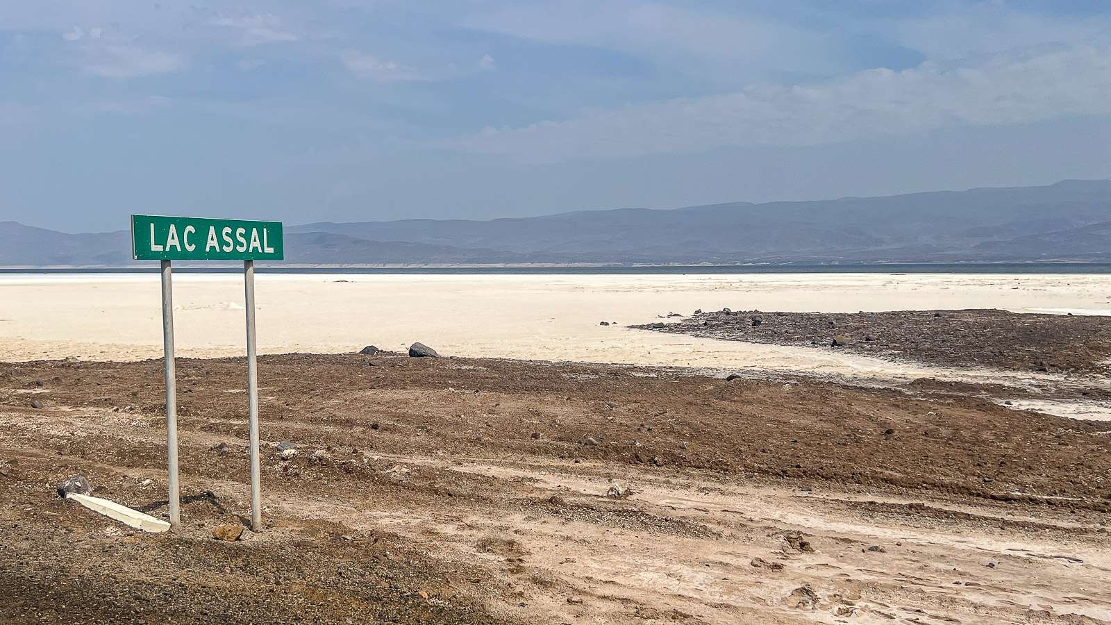 Lopulta lähestyimme Assal-järveä, suolajärveä, joka sijaitsee 155 metriä merenpinnan alapuolella ja on koko Afrikan mantereen matalin kohta. Maailmassa vain Kuollut meri ja Genesaretinjärvi ovat vielä matalammalla. Vahvasti suolainen vesi mahdollistaa järvessä kellumisen – samoin kuin Kuolleessameressä.