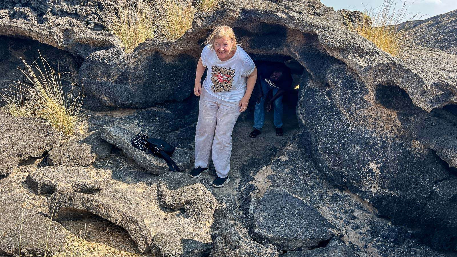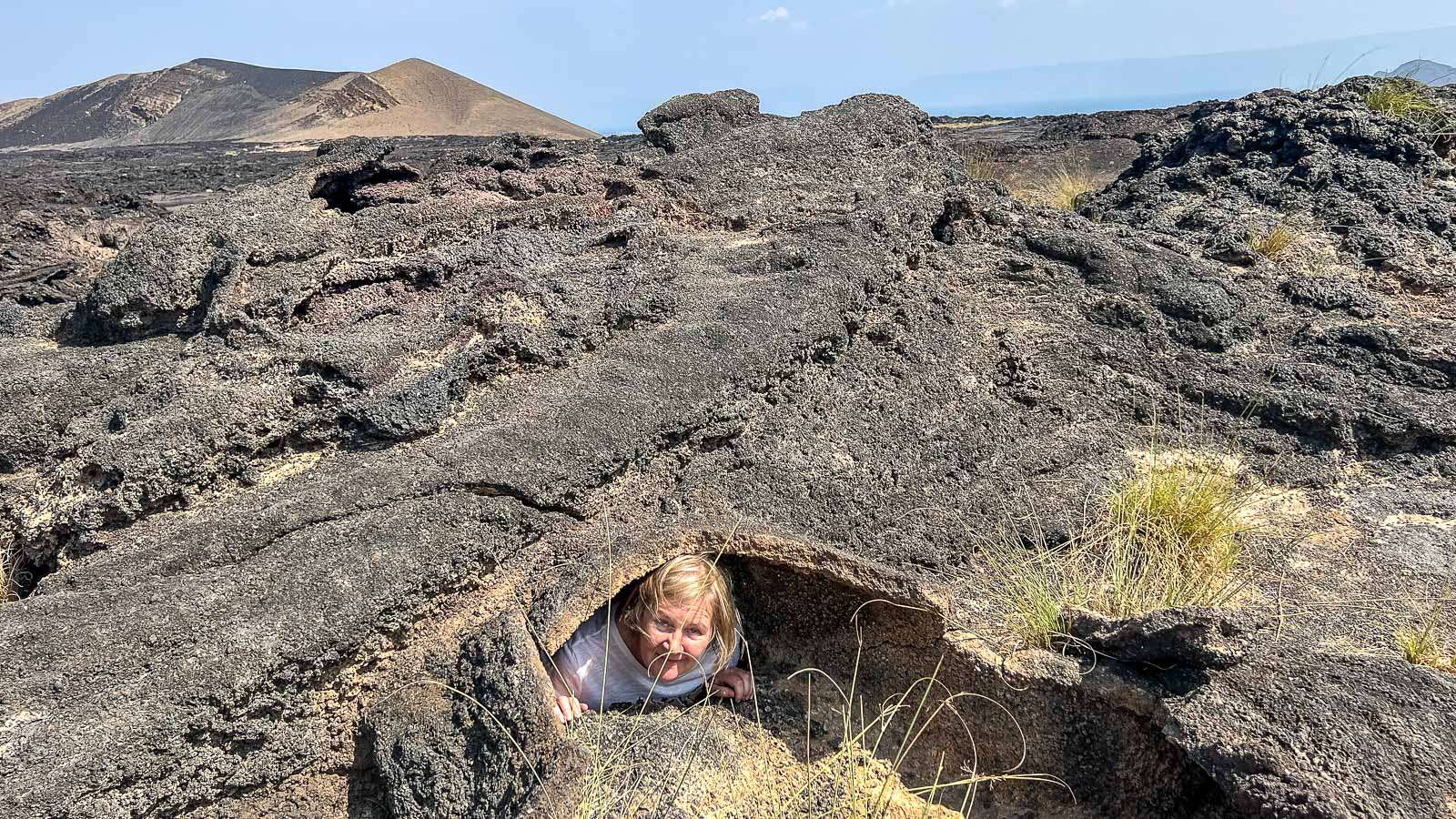 Kiipesimme me jonkin matkaa tulivuoren rinnettäkin, mutta hauskempia kohteita kuin rinteet olivat muutamaan kohtaan laavakenttää syntyneet pienet laavatunnelit. Ensimmäisen kerran vierailimme laavatunnelissa Jejun saarella. Myöhemmin koimme sellaisen myös Havaijilla. Nämä kummatkin tunnelit olivat isoja ja turistikohteiksi rakennettuja portaineen, pääsymaksuineen kaikkineen. Ihan sellaisia eivät pienet lähinnä ryömimiskokoiset tunnelit täällä olleet.