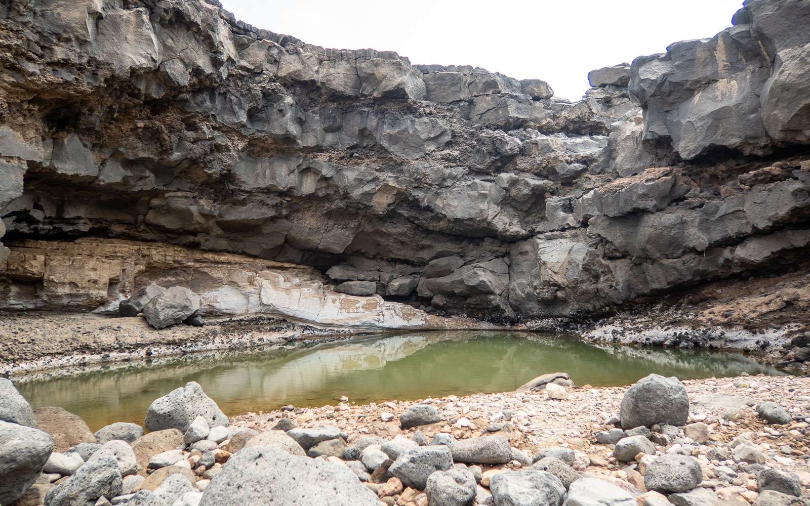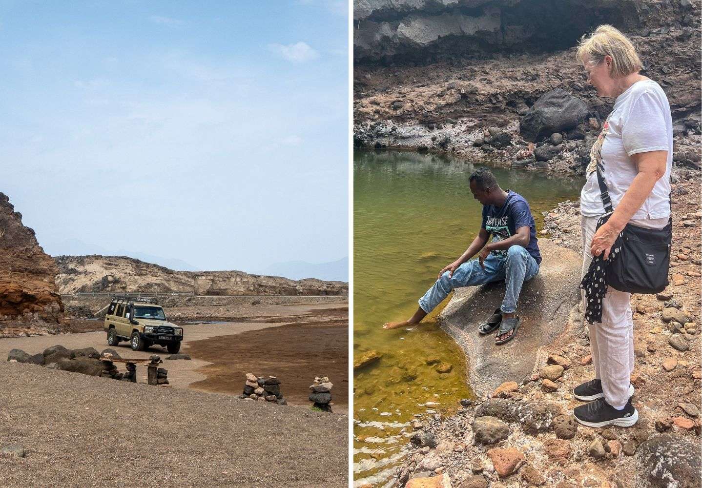 Mutta vielä ennen suolajärveä poikkesimme tutustumassa kuuman veden lähteeseen. Oppaamme varoitti hyvissä ajoin, ettei sinänsä kauniin kirkkaaseen veteen kannata laittaa kättä, sillä veden lämpötilan on tosiaan ehkä luokkaa 70 astetta. Pienessä lammessa lähteen takana vesi oli vähän viileämpää ja siinä viihtyivät pienet garra rufa-kalat, jotka olisivat toteuttaneet jalkoihimme kalapedikyyrin, jossa olisimme asettuneet rannan kiville jalat lammikossa. Oppaamme näytti mallia – ja tosiaan, pienet kalat tulivat syömään kuollutta solukkoa hänen jalkapohjistaan. Me skippasimme elämyksen, sillä Assal-järvi odotti jo!