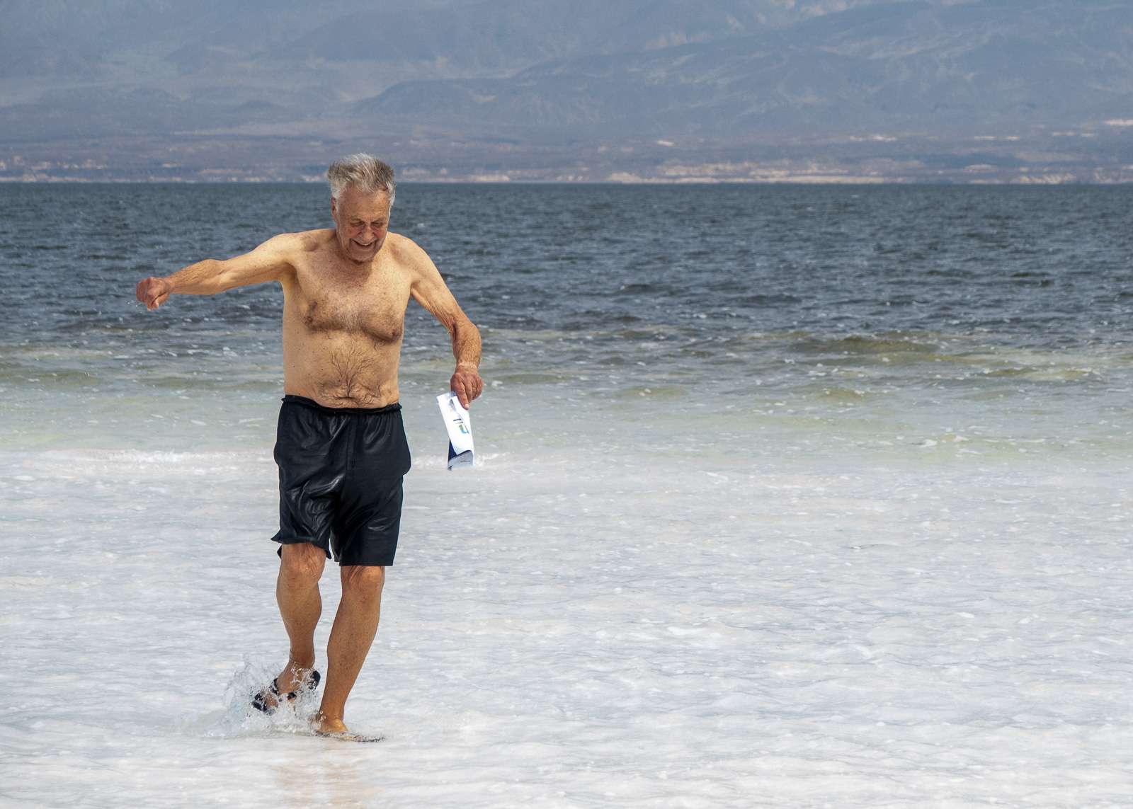 Assal-järvellä kellumiselämystä ei ole, vielä, tuotteistettu samaan tapaan kuin Kuolleellamerellä. Rannalla ei ole pukutiloja eikä suihkuja, joten meistä vain Lasse oli päättänyt kokeilla sitä. Valmisteluna hän oli jo valmiiksi pukeutunut uima-asuun ja varustautunut rantasandaaleilla. Oikeat uimatossut olisivat olleet parempi valinta, mutta emme olleet huomanneet pakata niitä mukaan. Puutarhahanskat tai vastaavat olisivat nekin kuulemma olleet paikallaan, etenkin siinä vaiheessa kun järvestä piti kiivetä takaisin suolakannelle.