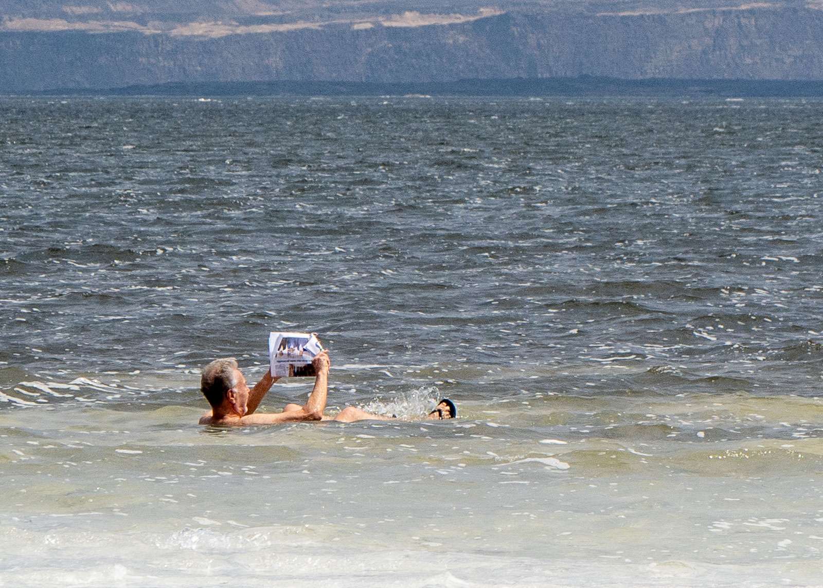 Lasse kuitenkin urheasti käveli reunalla ja pudottautui veteen – ja kellui! Hän oli myös varautunut päivän sanomalehdellä, sillä koska kelluminen jättää kädetkin vapaiksi, niin sitähän voi vaikka lukea lehteä! Kuolleellamerellä aikoinaan siskonlasten kanssa käydessämme mukana matkassa oli Aku Ankkoja, joita alakouluikäiset lapset sitten selailivat järvessä kelluessaan. Minä – ja paikallisoppaamme – yritimme tallentaa Lassen uimaretkeä kameraan, mutta kuvaaminen oli melko haastavaa pitkän etäisyyden takia. Lähemmäskään ei voinut lenkkarit jalassa mennä, paljaista jaloista puhumattakaan, sillä suolakansi oli hyvin karkeaa.