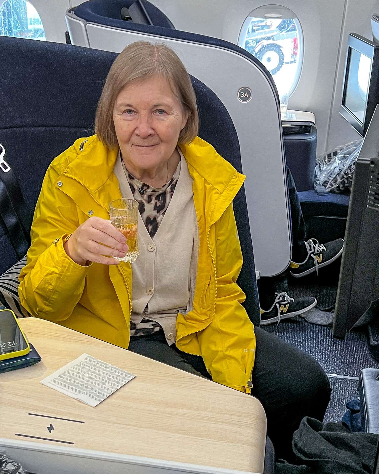 Hetken alkuun ihmettelin miten kaikki toimii, esimerkiksi miten tuolista saa sängyn tai päivälennolla leposohvan, sillä aukon yksi osa nostetaan edestä ja toinen osa liu’utetaan takaa. Tutustuin myös aikani eri lokerikkoihin, joista yksi on makuutason sivulla ja toinen selkänojassa. Vähän huolissani siitä, että unohtaisin niihin jotain en kuitenkaan käyttänyt kumpaakaan suljettavaa lokeroa oikein mihinkään – eipä ollut tavaroitakaan oikeastaan kuin käsilaukku, iPad ja puhelin. Lokeroiden lisäksi tarjolla on tietysti pistorasia ja USB-A- ja USB-C-latauspisteet. Langaton latausalustakin olisi ollut, mutta emme ole moista ominaisuutta laitteisiimme hommanneet.