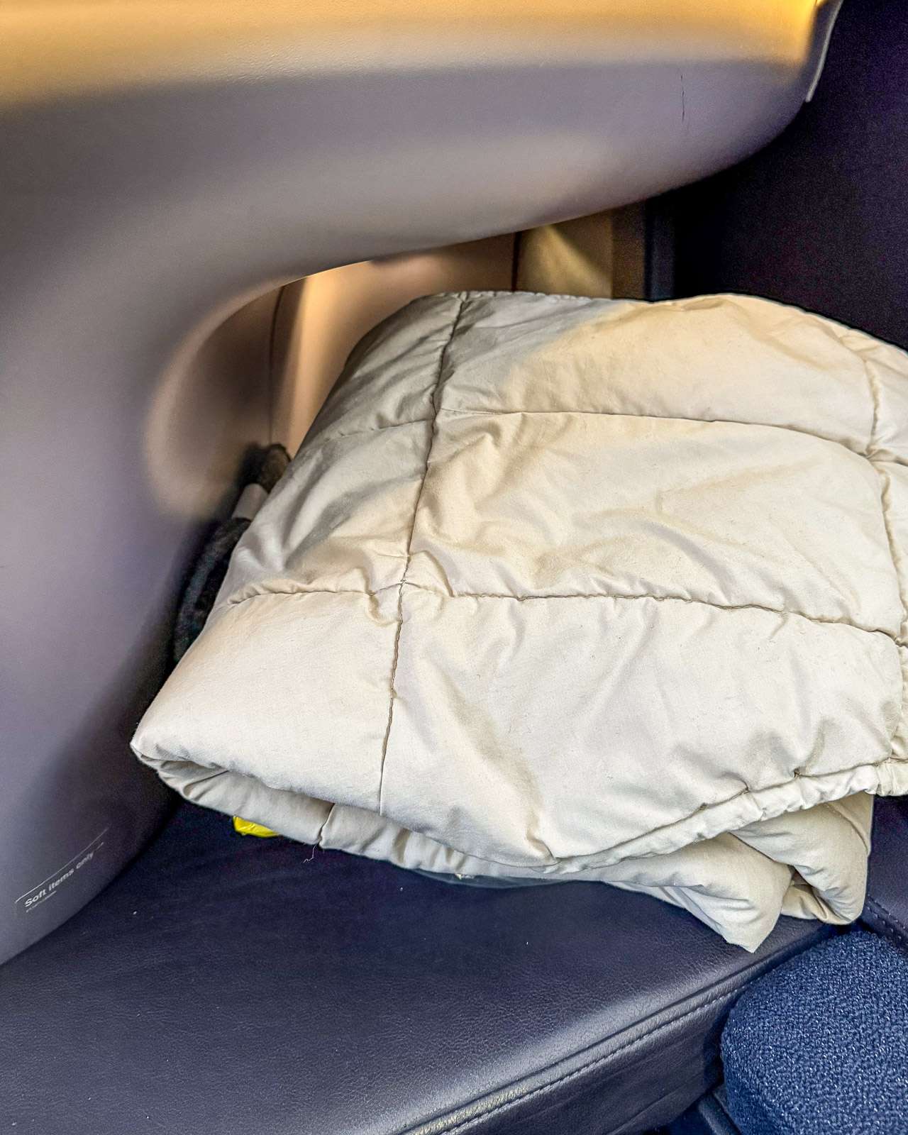 Istuimen lisäksi tarjolla oli jo ohimennen mainitsemani patja, raidallinen peitto, kaksi erilaista tyynyä, varustepussi, joita en avannutkaan, sillä käsilaukussani oli jo lennoilla tarvitsemani asiat, kuten vaikka hammasharja ja -tahna. Lisäksi mukana oli mielestäni hyvin niin äänet vaimentava kuin elokuvien äänet toistavat kuulokkeet. Kansainvälisissä matkailuryhmissä businessluokan lennoilla monet odottavat saavansa myös pyjaman, mutta itse en usko, että olisin sellaista yölennollakaan kaivannut. Harmaat huopatohvelit sen sijaan olivat kivat – mukavampi niillä oli koneessa liikuskella kuin sukkasillaan!