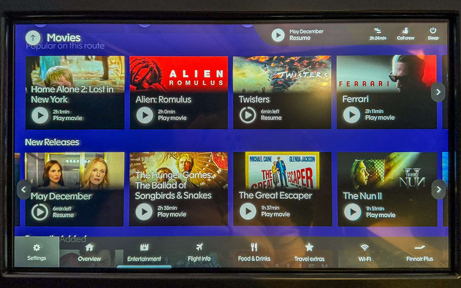 Viihdetarjontakin kelpasi, katsoin jopa kaksi Letterboxin watchlistilläni ollutta elokuvaa lennon aikana, eli Twistersin ja May June -elokuvat. Eipähän tarvitse enää kumpaakaan odottaa tulevaksi johonkin suoratoistopalveluun tai jonottaa kirjastosta! Ehdin myös lukemaan aikaisemmin lukemani Jari ja Kati Tervon Ukko-kirjan jatko-osan Ukko ja Mökki. Lukuaikani tammikuulta olin itse asiassa jo kuluttanut melkein loppuun ennen lentoa, mutta offline-tilassa etukäteen ladattujen kirjojen lukeminen onnistuu yli sallitun tuntimääränkin :-)