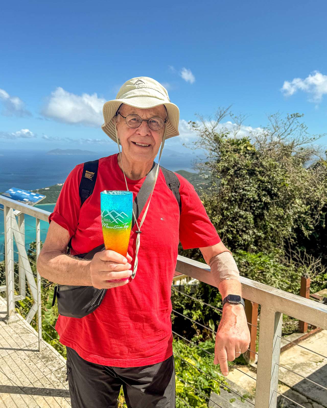 Mountain Topin näköalaterassilta näkyi tosiaan Brittiläisiin Neitsytsaariin kuuluvia saaria ja St. Johnin saari. Myös Magens Bayn saaren upeimmaksi mainitun hiekkarannan näki täältä, yläilmoista. Oppaamme muisti myös mainita, että asuntojen hinnat ovat saarella korkeimmat Magens Bayn alueella, alle miljoonalla dollarilla ei kannata kuulemma etsiä. No, emme olleet etsimässä. Mountain Topin baari kehuskelee keksineensä Banana Daiquri -drinkin, jota sitten myydäänkin siellä mieluiten jokaiselle kävijälle. Hedelmäisenä se kävikin pienestä lounaasta, isosta tuopista nauttina kahdelle. Tuopin sai pitää – ja poikkeuksellisesti toimme sen ihan kotiin asti, vaikka se pahinta mahdollista kitschiä edustaakin. Paikan matkamuistomyymälä oli suurin matkallamme näkemä, mutta tuhansista tarjolla olevista t-paidoista emme kuitenkaan löytäneet mielestämme (emme kyllä tarkkaan ottaen etsineetkään).