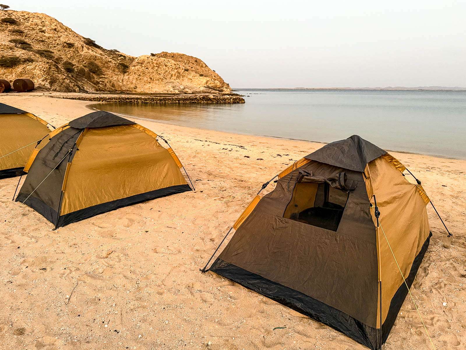 Massawasta teille veneretken Dahlakin saaristoon kuuluvalle Dissein saarelle, jossa vietimme yön meitä lukuunottamatta autiolla hiekkarannalla (ja saarella) yhden hengen teltoissa. Etukäteen olimme tästä osioista hiukan huolissamme, sillä jotain satunnaista takapihallamme viettämäämme Nuku yö ulkona -tempauksen yötä lukuunottamatta emme ole vuosiin telttailleet. Purjeveneessä olemme toki asuneet, mutta telttaan verrattuna vene on kovin sivistynyt ympäristö sänkyineen, puhtaine lakanoineen ja sisävessoineen. Mutta hyvin sekin lopulta meni – kuten siirtymiset veneistä hiekkarannalla ja takaisin veneeseen :-)