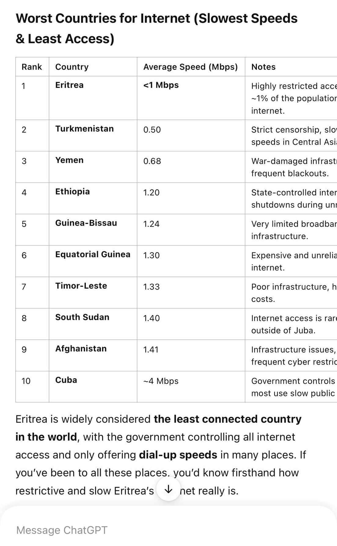 Nettilistalta tuntuu löytyvän myös Guinea-Bissau ja Itä-Timor, mutta en muista, että minulla olisi ollut hankaluuksia netin kanssa kummassakaan noista. Ehkä hotelleissa on keskivertoa paremmat yhteydet. Kuubassa piti ostaa raaputusarpoja, mutta kyllä niillä sitten pääsi nettiin ihan kelvollisesti, kunhan vain arpoja jostain sai. Hotellissa loppuivat kesken. Asmarassa ei kyllä ollut helppoa, vaikka Ylen sivuille, Googleen, Googlemapsiin ja Wikipediaan pääsi ongelmitta. Monille sivuille ei päässyt ollenkaan.