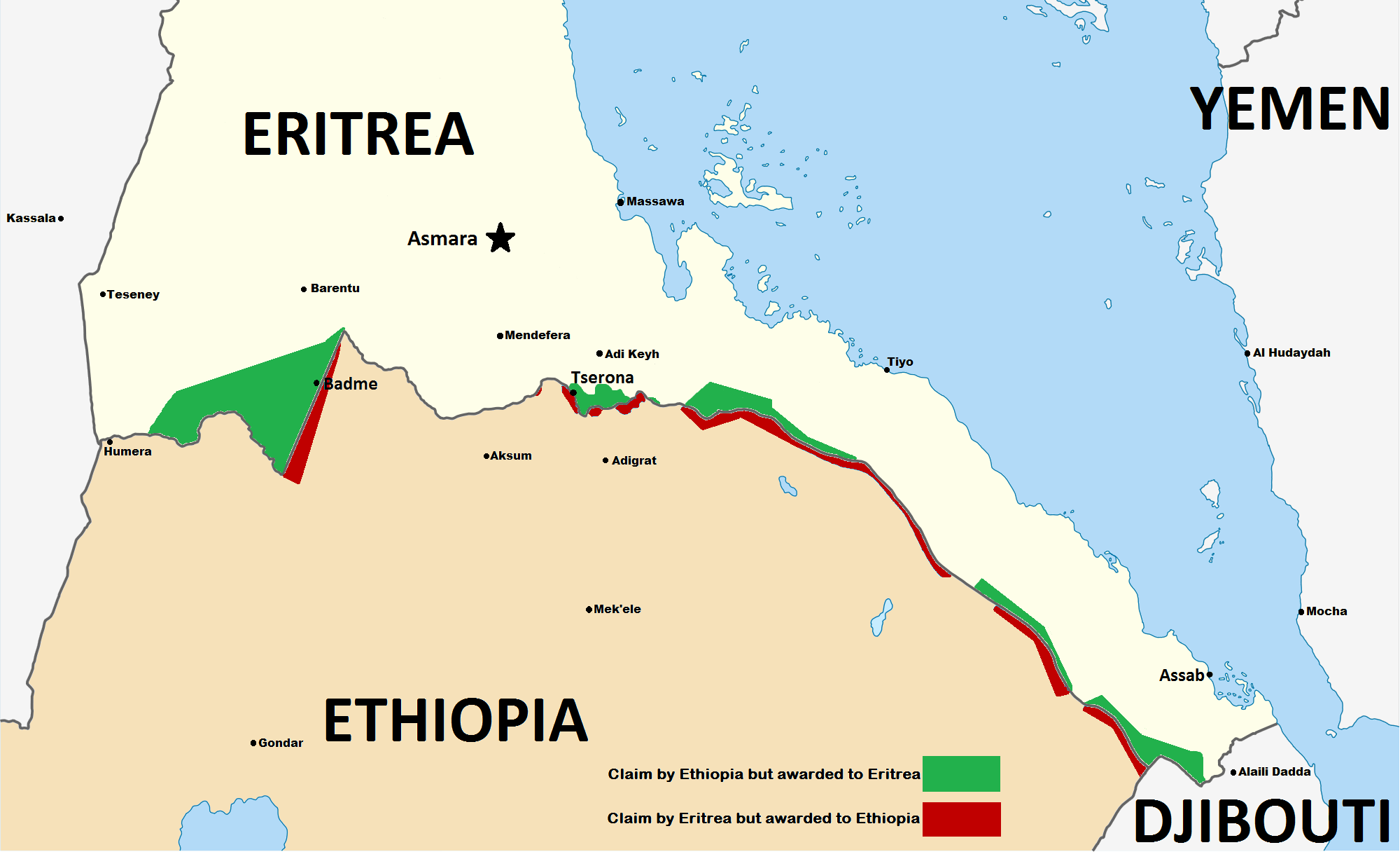 1998 Eritrea valtasi Badmen alueen, johon Etiopia vastasi pommittamalla Asmaraa ja Massawaa. Eritrea joutui lopulta perääntymään ja rajan määrittämiseksi asetettiin Eritrea-Etiopia-rajakomissio Algerin rauhansopimuksessa vuonna 2000. YK:n rauhanturvaajat tulivat valvomaan raja-aluetta. Sopimuksen mukaan Badme kuului Eritrealle, mutta Etiopia kieltäytyi alueluovutuksista. Rauhansopimus maiden välillä solmittiin vasta 2018.