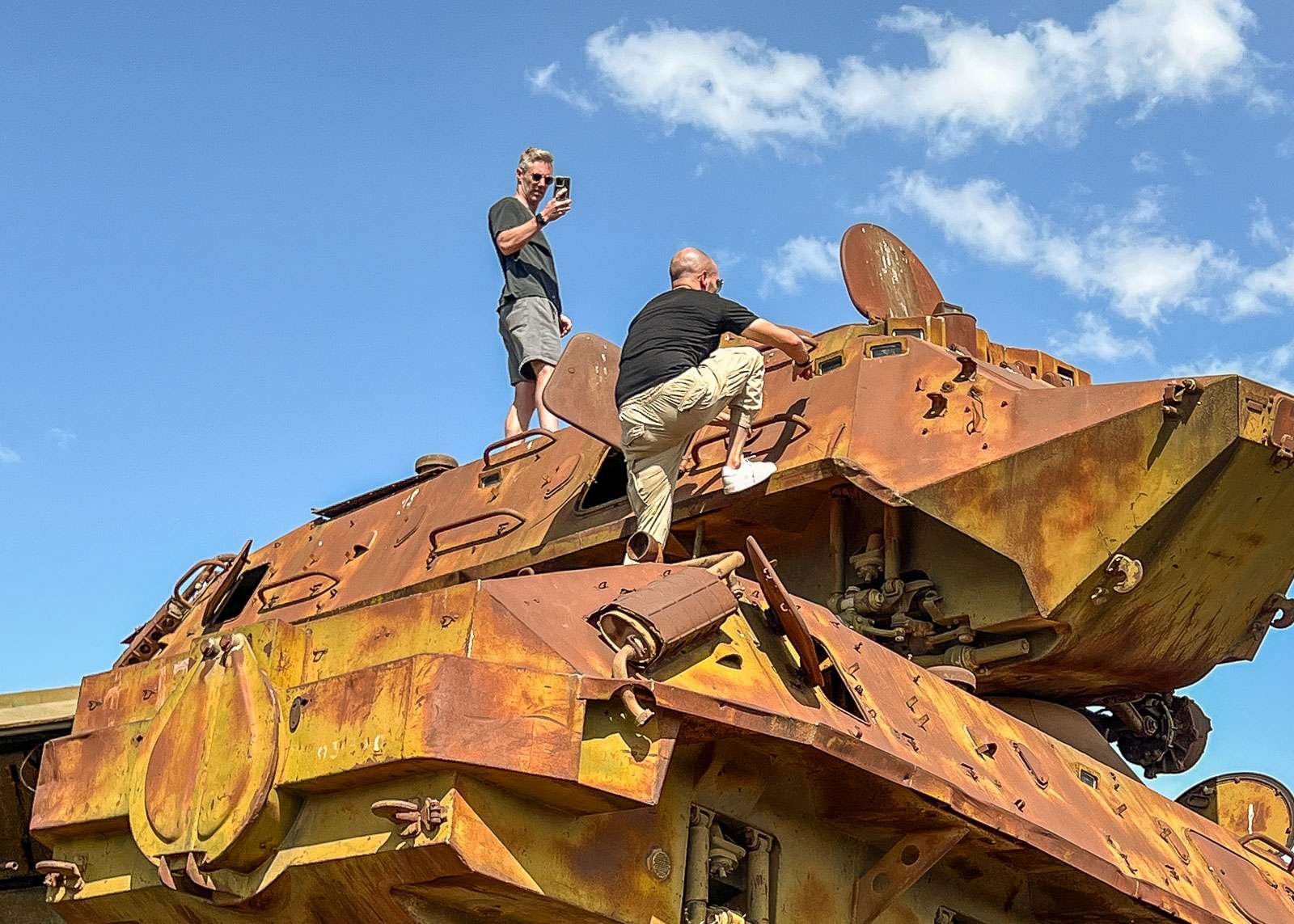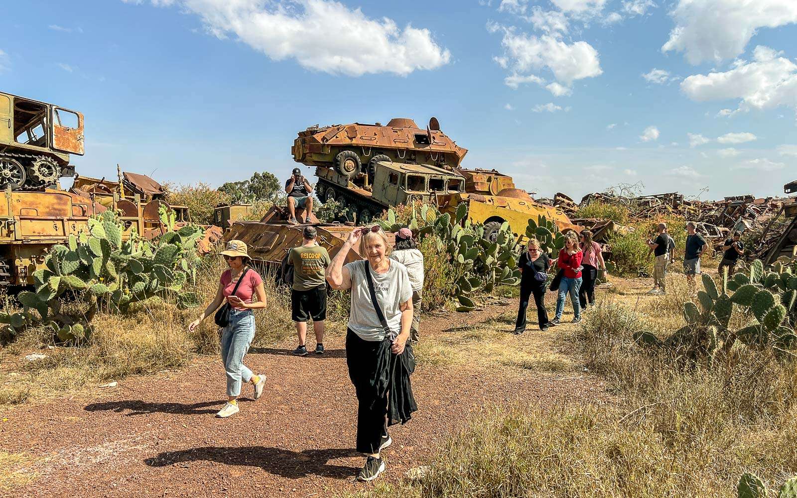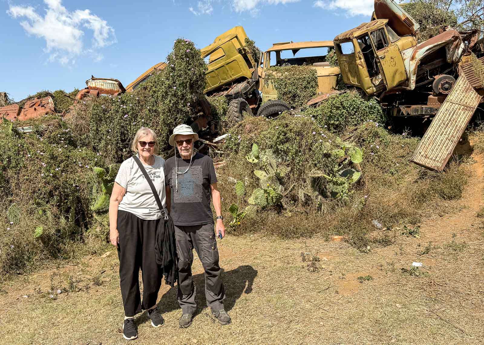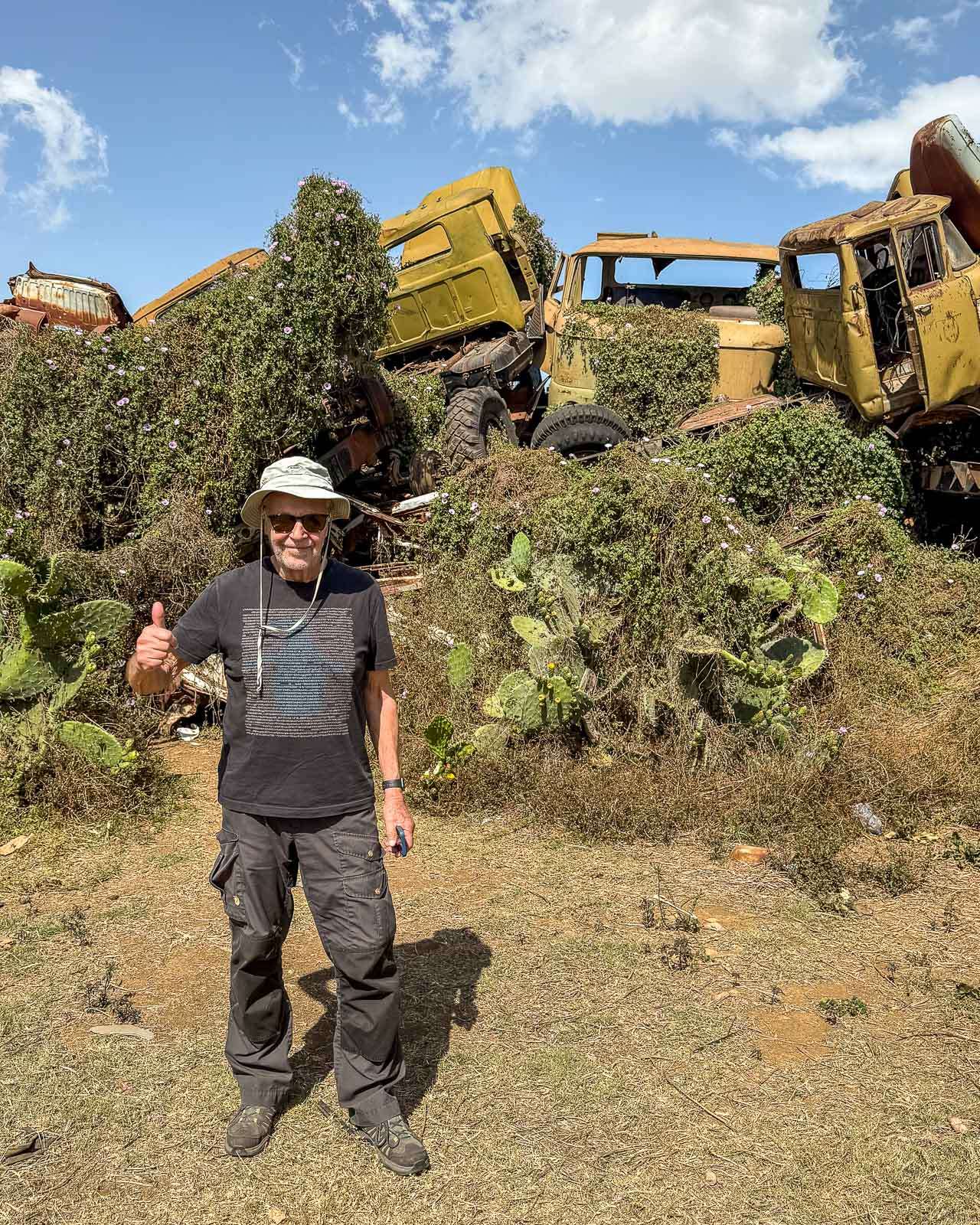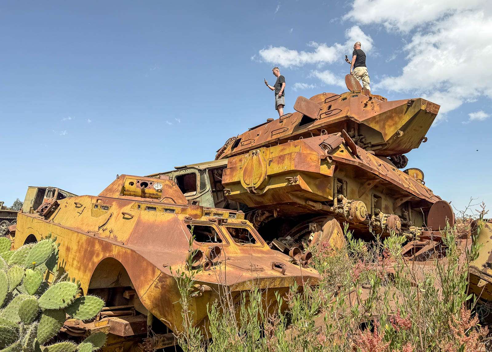 Tankkien hautausmaa yli yksi ensimmäisiä vierailukohteitamme Eritreassa, sillä poikkesimme siellä jo matkamme toisena päivänä matkalla Massawan satamakaupunkiin. Etenkin ryhmämme joitakin Lassea hiukan nuorempia miehiä tankit, rämätkin, tuntuivat innostavan kovasti!