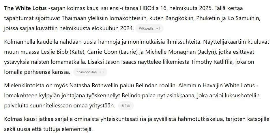 Näin chatgpt kuvaa White Lotus -sarjan kolmatta kautta. En ota sen enempää siihen kantaa, sillä olen ehtinyt katsoa vasta pari ensimmäistä jaksoa.