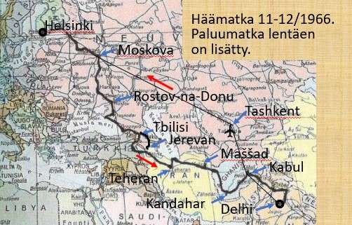 Suomen suurlähettiläs tarjosi meille Delhissä illallisen ja ystävällinen lähetystösihteeri lupasi huolehtia autostamme. Lähdimme Stinan kanssa kotiin lentäen Kabulin kautta. Kabul oli mustan pörssin kaupan keskus. Sieltä sai Intian rupioita ja Neuvostoliiton ruplia pilahinnalla. Lentolippu sieltä Moskovan kautta Leningradiinkin oli naurettavan halpa. Lentoa odotellessamme kävimme paikallisen suomalaisen YK:n työtekijän kanssa YK:n autolla Salangin tunnelin suulla 3200 m korkeudessa. Se yhdistää eteläisen ja pohjoisen Afganistanin. Ostimme Kabulista myös pitkät ja valtavan suuret lampaannahkaturkit. Ne tosin haisivat, koska nahka ei ollut parkittua. Leningradista tulimme junalla kotiin.”