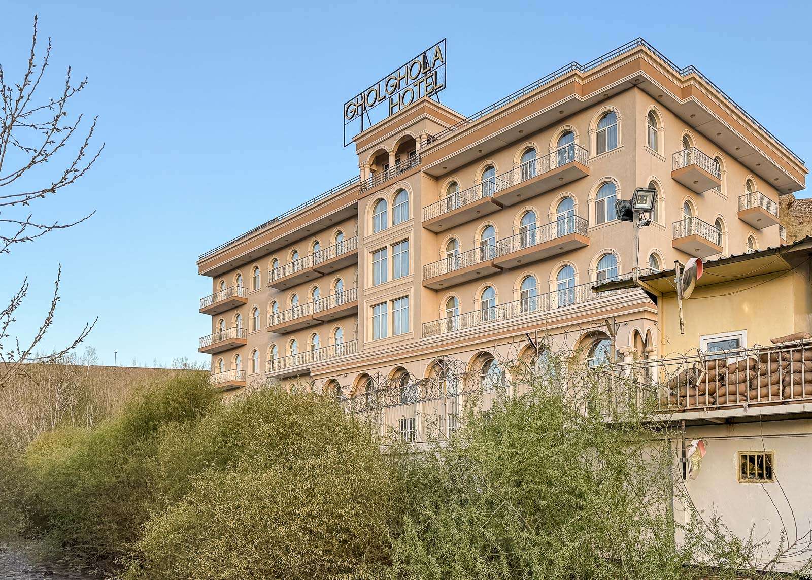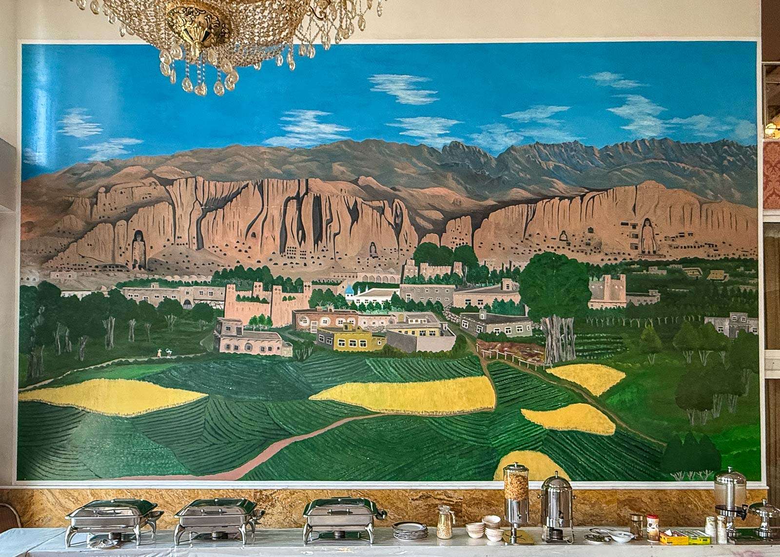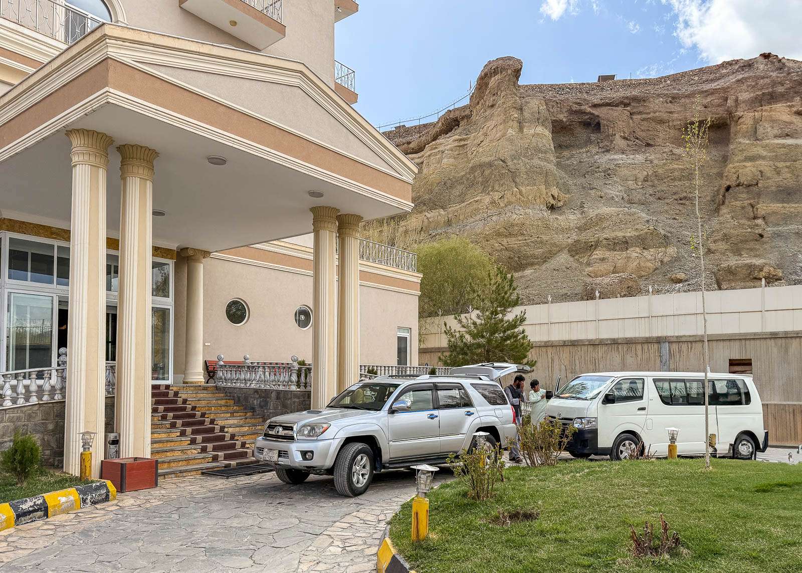 Saapuessamme Bamiyaniin jouduimme pitkähkön ajopäivän (vajaat 180 km, tunneissa 5 tuntia, sisältäen lounastauon) jälkeen ensin käymään kaupungin rekisteröintitoimistossa ja vasta sen jälkeen pääsimme hotellille. Gholghola-hotelli on sekä upea että alkeellinen. Rakennus oli mahtipontinen ja huoneetkin, parvekkeineen ihan tilavia, mutta esimerkiksi sähköä oli vaan muutaman tunnin ajan aamuisin ja iltaisin. Sähköttömyys tarkoitti myös, että hotellissa asuminen tarkoitti reipasta porrastreenia, ainakin, jos onnistut (?) saamaan huoneen ylimmistä kerroksista. Hissikin oli, mutta se toimi kolmen yön mittaisella vierailullamme vain kerran. Oppaamme kertoi myös hotellista, että sen omistaja onnistui muuttamaan ulkomaille talibanien tullessa valtaan, eikä voi palata Afganistaniin, mutta ilmeisesti hänellä on luotettavat kumppanit, jotka pitävät hotellin toiminnassa.