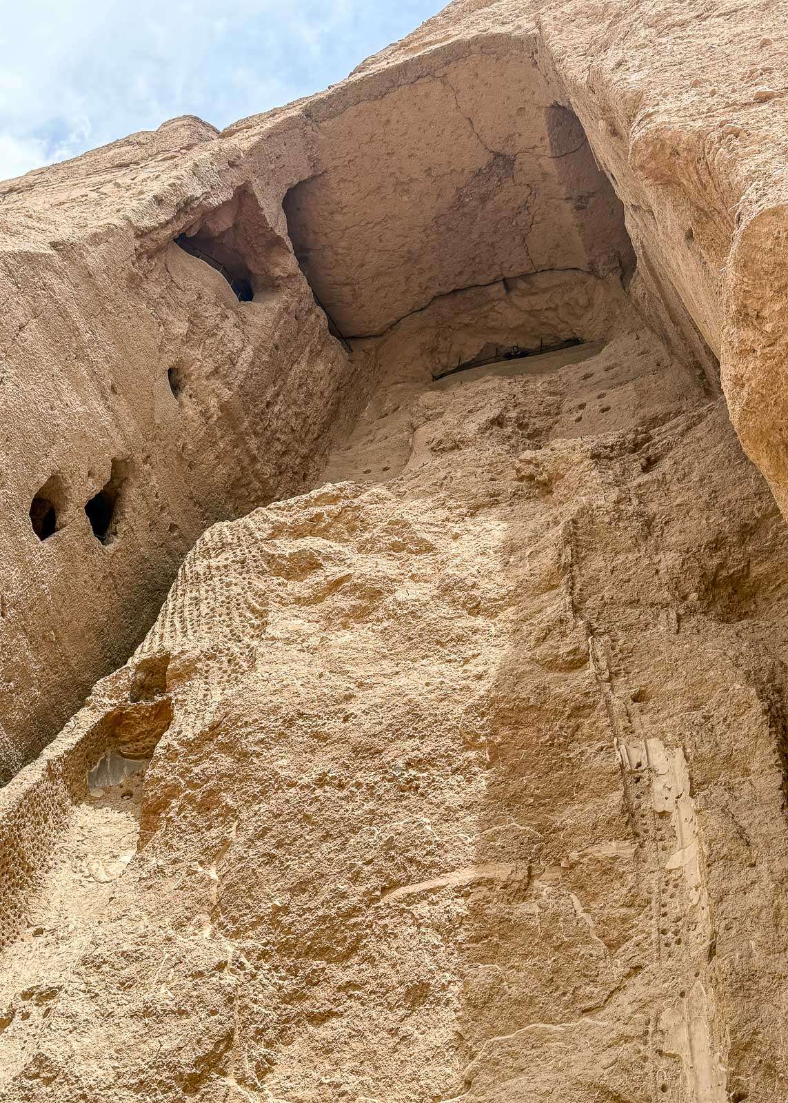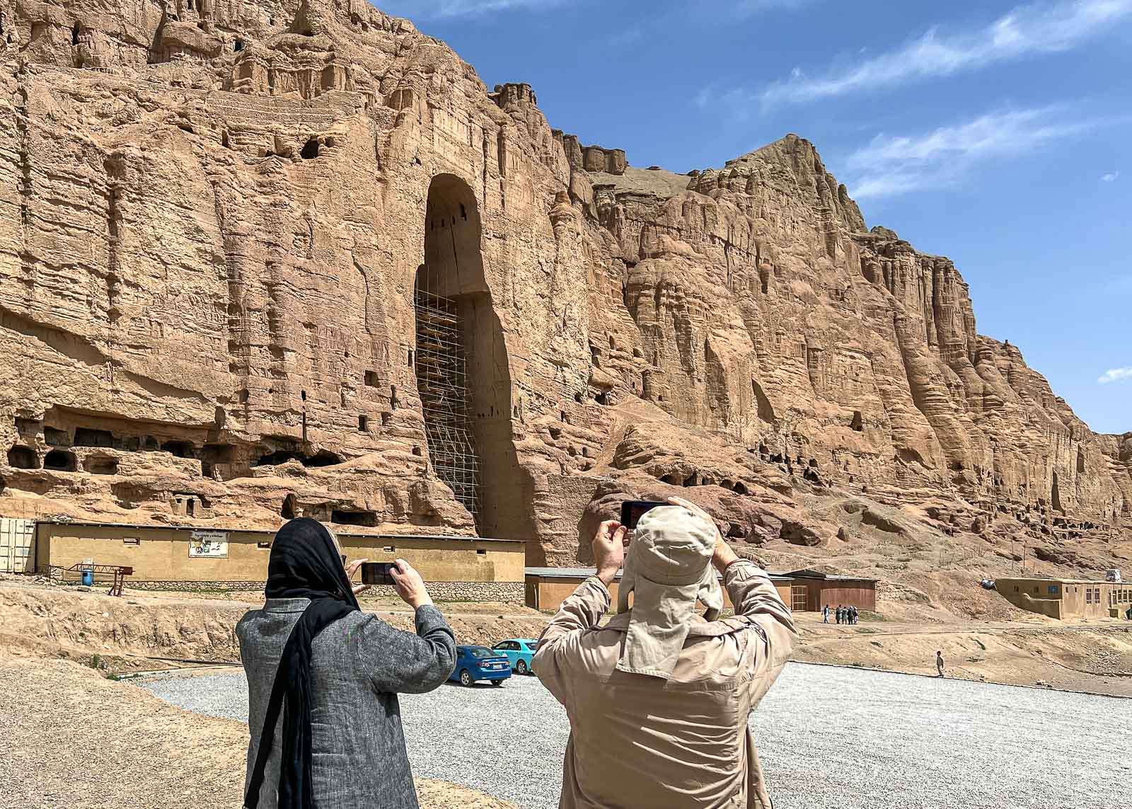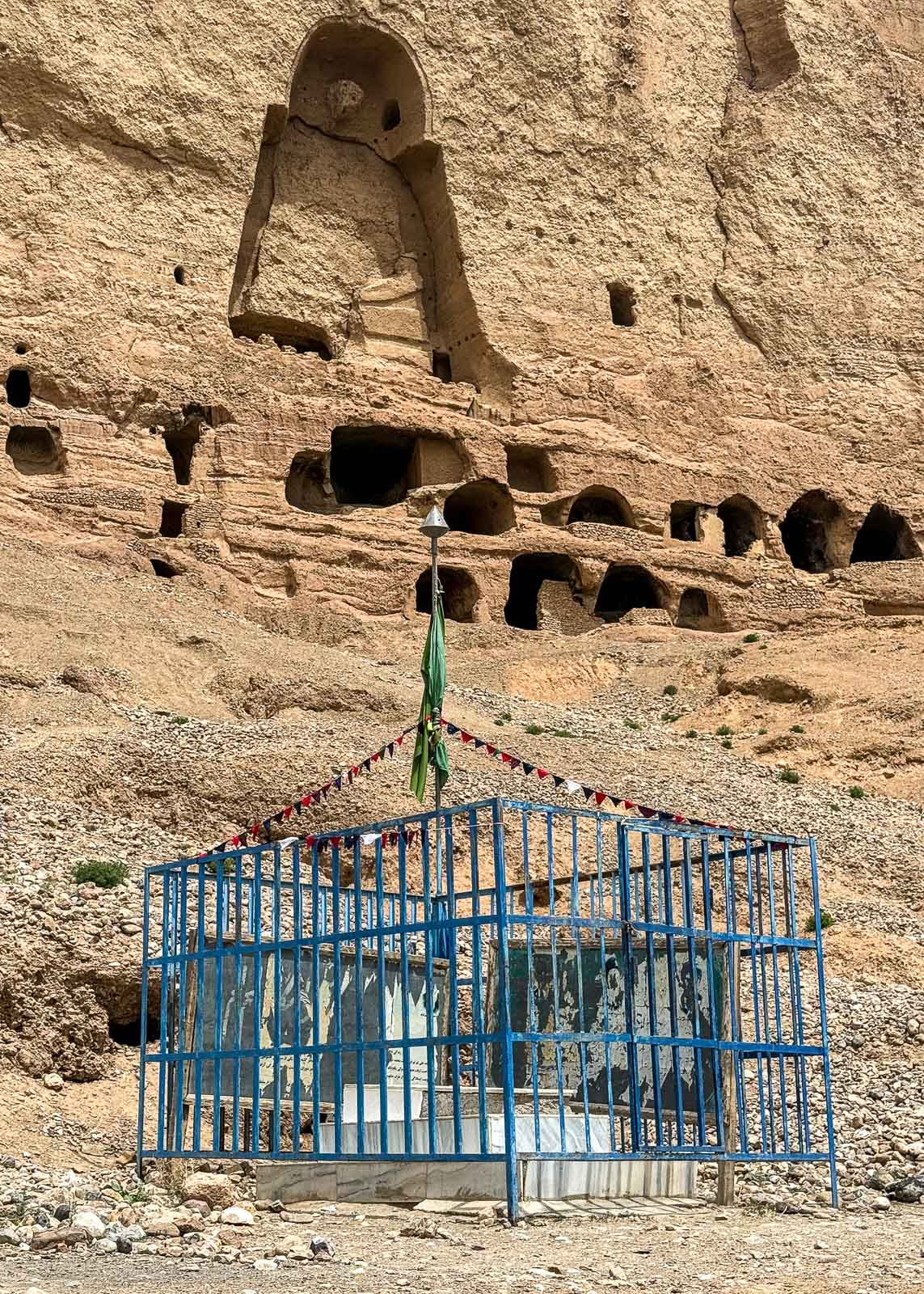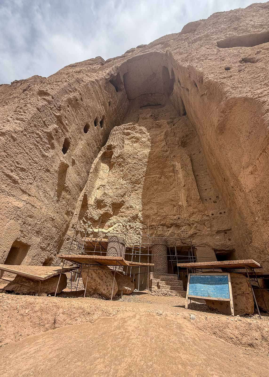 Mutta, pienistä viis – aukenihan hotellihuoneen parvekkeilta Bamiyanin paras näköala! Vastapäisessä kallioseinämässä näkyivät molemmat buddhanmuotoiset kolot. Isompi buddha on ollut 55 metriä korkea ja vähän pienempi 38 metriä. Näiden suurimpien kolojen lisäksi kallioseinämässä oli runsaasti pienempiä. Kallioon louhituissa luolissa asuttiin aikoinaan, aina buddhien tuhoamiseen asti – kuulemma lähes 500 ihmistä häädettiin samassa yhteydessä alkeellisistä kodeistaan. Buddhapatsaitakin ja erilaisia maalauksia sijaitsi myös pienemmissä luolissa, mutta talibanit tekivät kuulemma huolellista työtä eikä noin mitään muuta kuin tyhjät aukot kallioseinämässä jäänyt jäljelle.