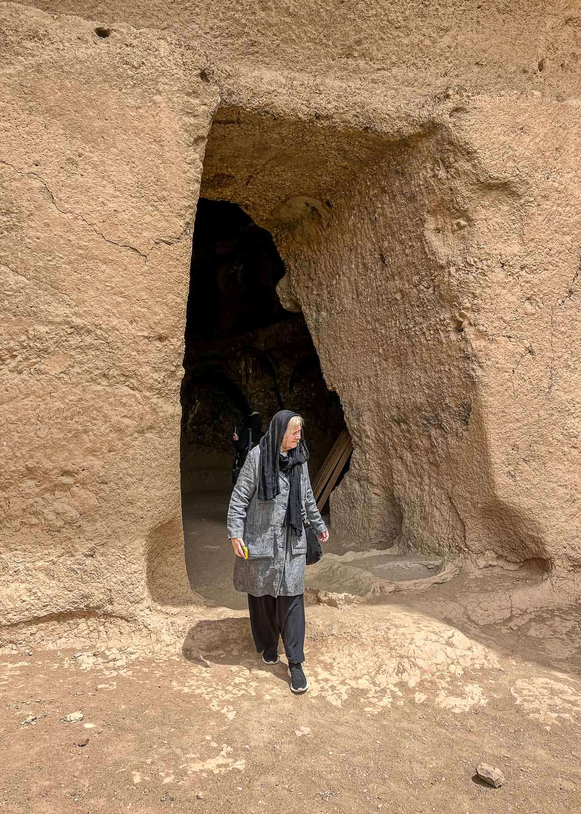 Isolta buddhalta siirryimme seuraavaksi pienemmän buddhan aukon luokse. Täälläkin oli tallessa patsaan osia, mutta täällä oli myös mahdollista kiivetä seinämään koverrettuja portaita pitkin ensimmäisellä tasolla olevaan luolastoon ja siitä ylöspäin aina buddhan pään tasolle asti. Kiipeäminen ei kuitenkaan ole ihan kesy juttu, sillä portaat olivat paikoitellen puolen metrin korkuisia ja ylös asti kiivetessä niitä olisi varmaan ollut ainakin sata. Muutamat ryhmästämme kyllä kiipesivät ylös asti, mutta meille riitti kipuaminen ensimmäisellä tasolla olevaan pieneen luolaan.
