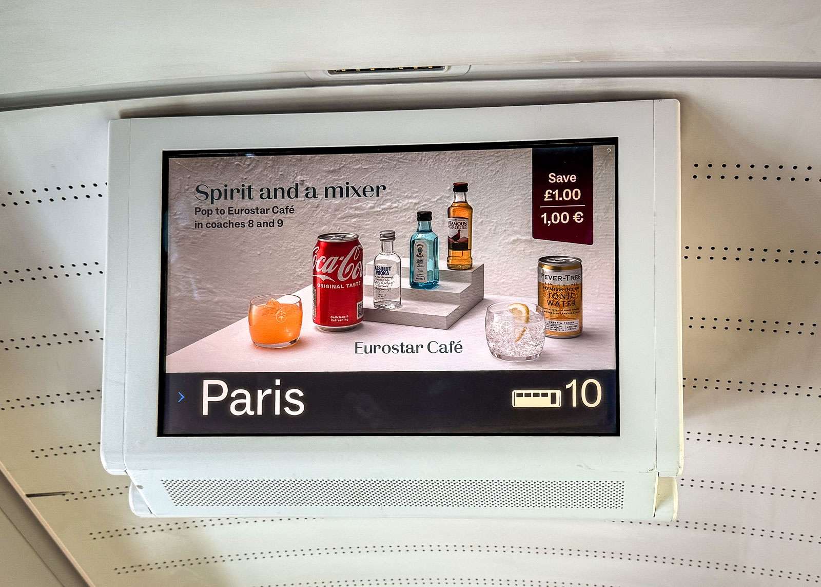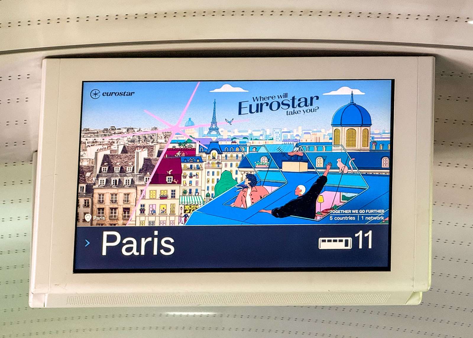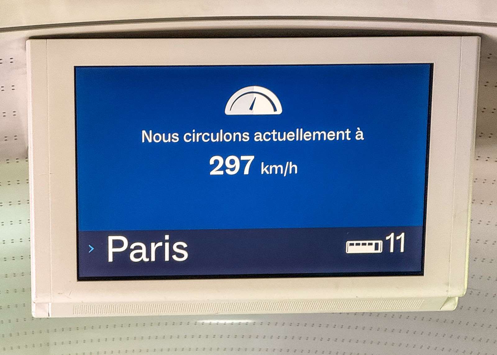 Loppumatka sujuikin sitten rauhallisemmin. Tunnelissa ei enää maisemia juuri ollut, mutta iPad tai puhelin tarjosivat riittävästi viihdykettä. Lasse kuvaili ahkerasti vaunun monitoriakin pyrkien saamaan kuvan suurimmasta näkemästään nopeudesta. Eväätkin tuli nautittua. Junassa on myös ravintolavaunu, tasoa VR – tai vähän sen alle, eli kannattaa ostaa eväät jo asemalta. Junassa on myös, teoriassa, wifi. Ranskan, eli Euroopan, puolelle noustuamme vaihdoimme kyllä heti 4G:hen, sillä se tarjosi paljon paremman yhteyden. Sähköäkin junassa taidettiin väittää olevan, muttemme sitä ainakaan istumapaikkojemme läheisyydestä löytäneet. Tarvittaessa aina reissussa mukana olevat varavoimalähteemme olisivat tulleet avuksi.