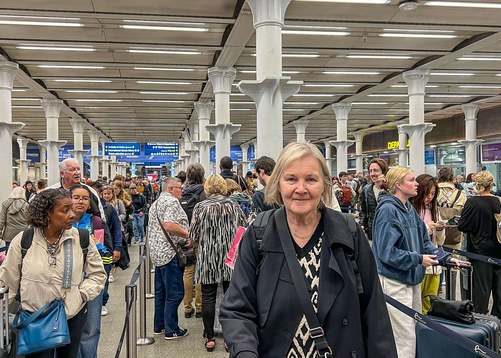 Hetken päästä virkailijat alkoivat järjestellä uudelleen Pariisiin menijöiden jonoa ja taas edettiin hiukan, edelleen asemahallissa. Lopulta jono eteni niin paljon, että näimme jo Eurostarin odotusalueen sisäänmenoportit ja turvatarkastuslinjat, mutta tovin silläkin alueella kiersimme hallia jonossa edestakaisin ennen kuin oli meidän vuoromme.