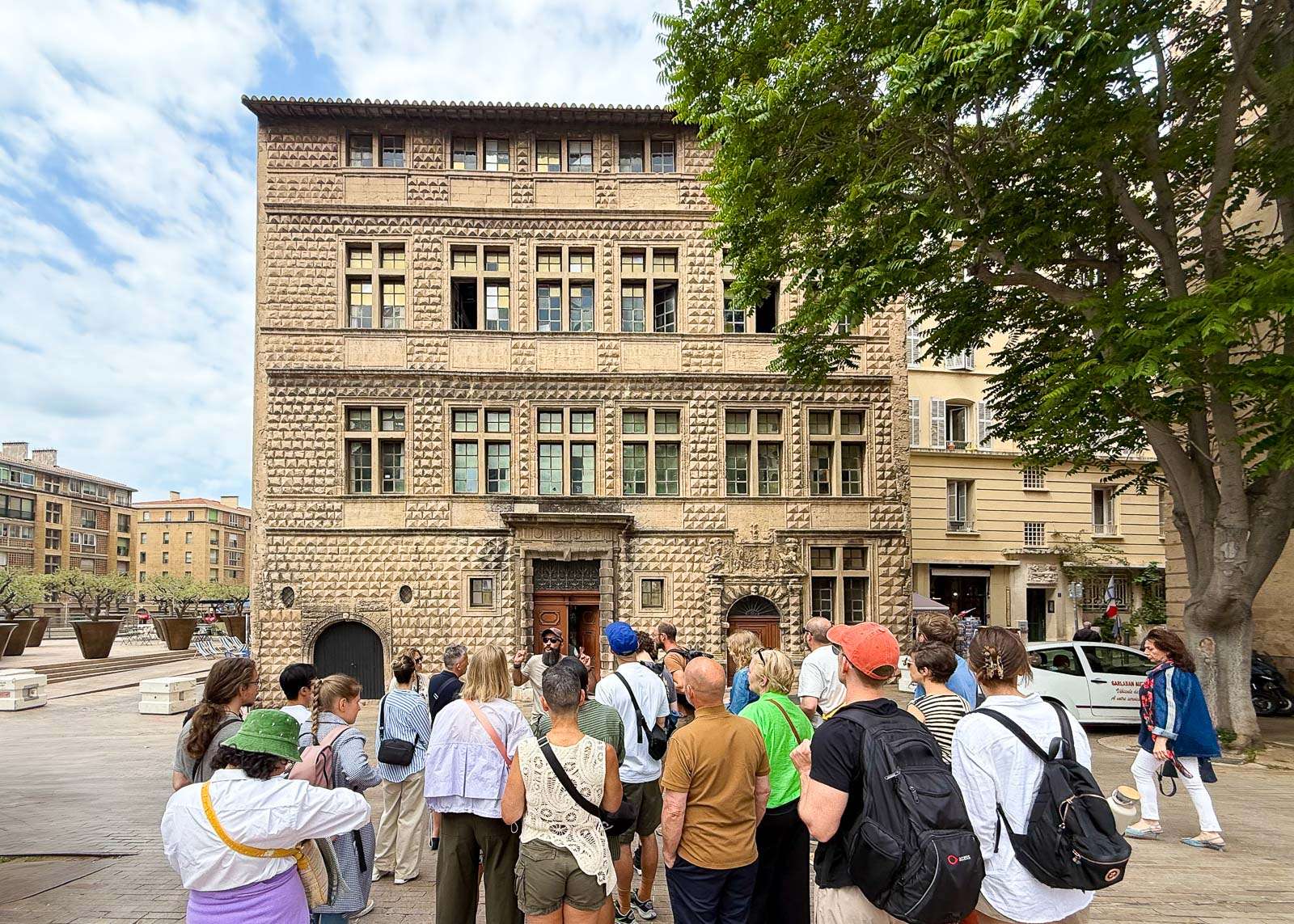 Kierrämme katsomassa muutaman alueen rakennuksen, kuten sodan jälkeen sairaalaksi rakennetun nykyisen kaupungin ykköshotellin, Intercontinentalin, julkisivunsa takia timanttitalona tunnetun talon ja kaupungintalon ja jatkamme sen jälkeen Le Panierin alueelle. Timanttitalo säästyi saksalaisiltakin, sen verran merkittävänä myös he pitivät sen arkkitehtuuria.