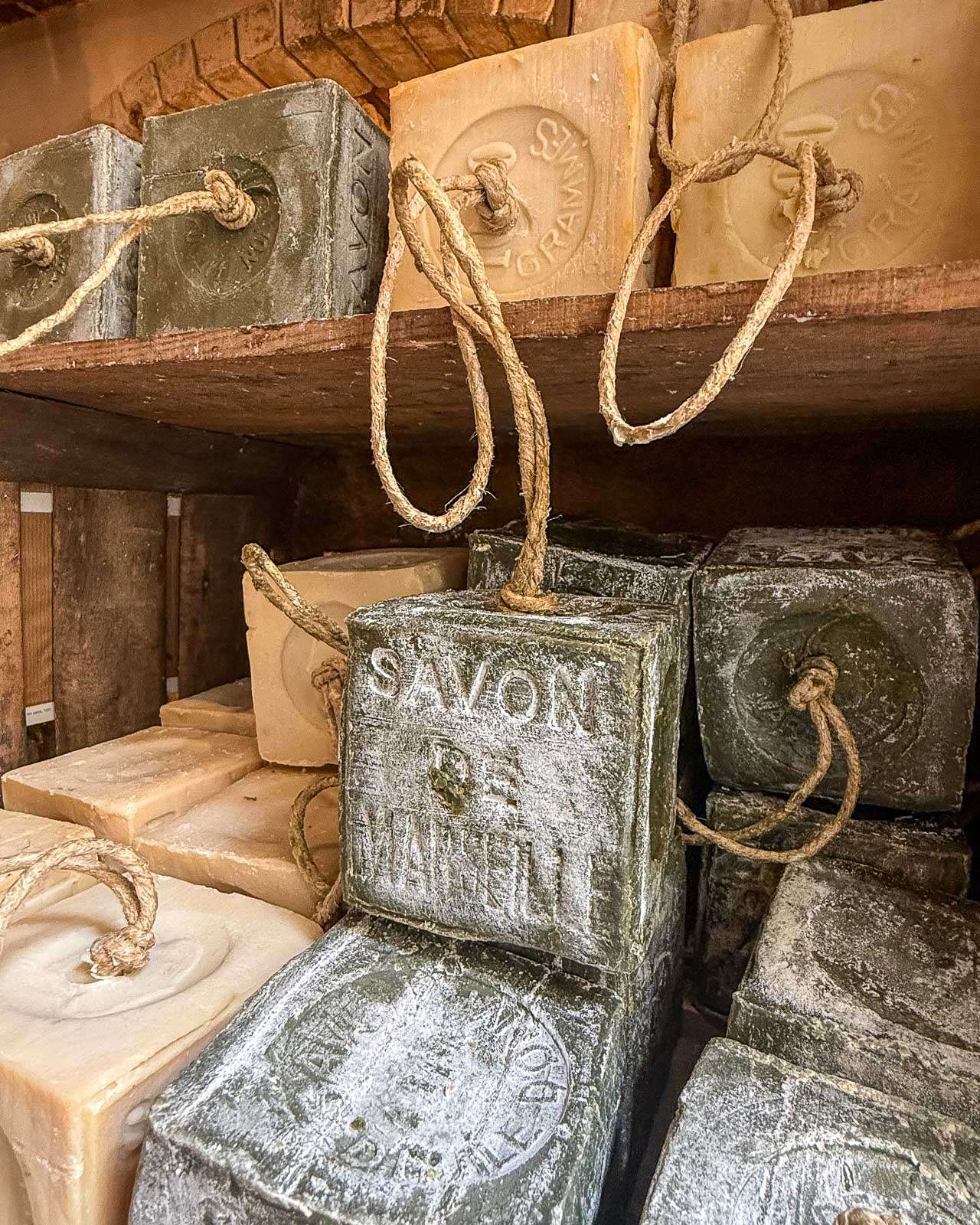 Se oikein marseille-saippua sisältää vähintään 72-prosenttia kasviöljyä, usein oliiviöljyä, eikä sisällä hajusteita, väri- tai säilöntäaineita. Kävelykierroksemme opas suositteli ostamaan ison vihreän kuution, ehkä jopa 10 x 10 x 10 senttiä, jossa on ripustusnaru – se olisi kuulemma marseille-saippuaa aidoimmillaan. Lopulta tulin kyllä siihen tulokseen, etten haluaisi moista möhkälettä roikkumaan suihkuumme seuraavaksi arviolta vuodeksi ja päädyin ostamaan muutaman pienemmän, ja asiattomasti vähän hajustetun ja väritetynkin marseille-saippuan.