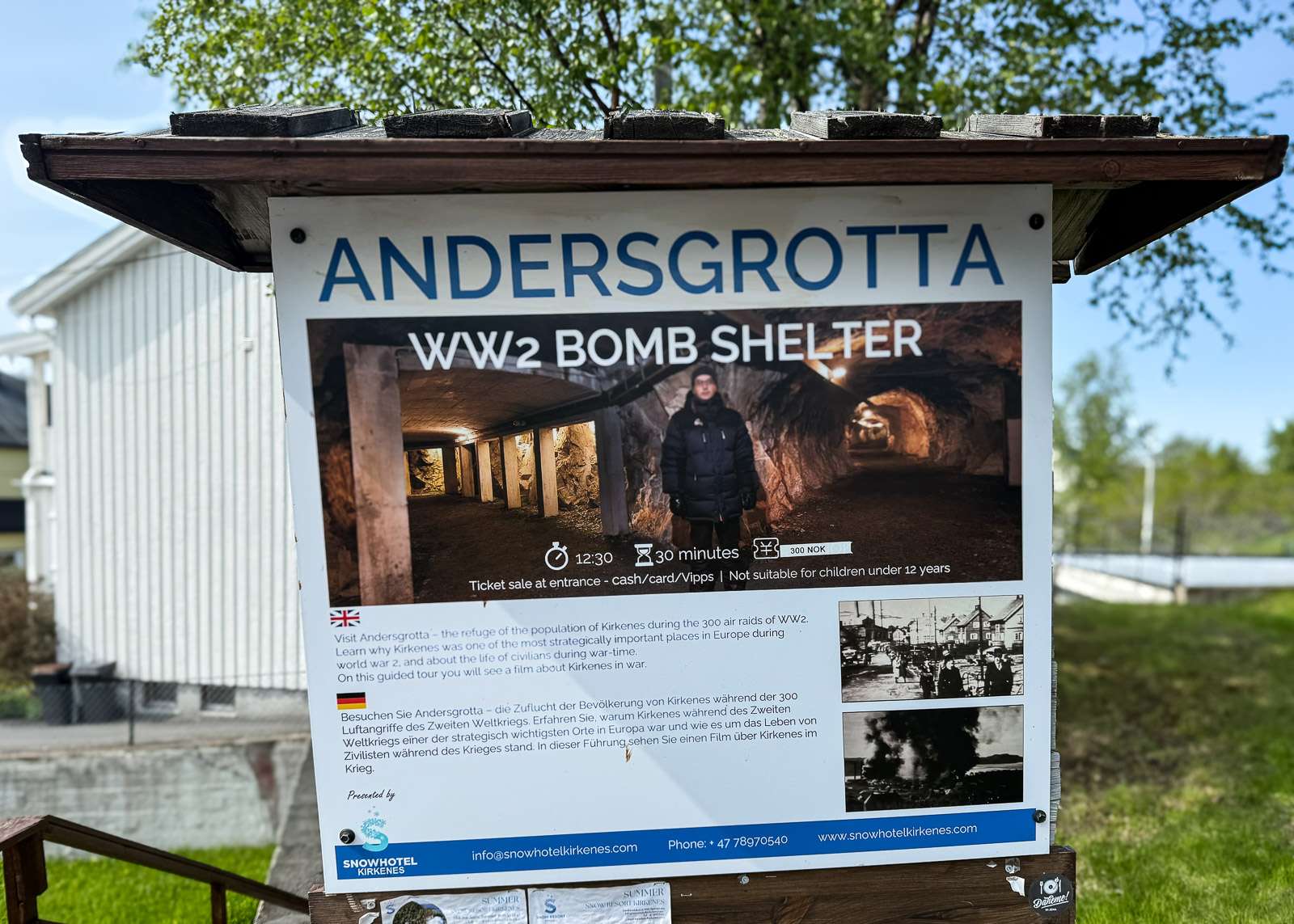Pommisuoja on nykyisin osa Kirkkoniemen lumihotellia (Snowhotel Kirkenes), joka kehuu olevansa ainoa lumihotelli maailmassa, joka tarjoaa hyistä majoitusta ympäri vuoden. Emme käyneet siellä, sillä se ei sijaitse ihan Kirkkoniemen keskustassa. Heidän sivuiltaan voi muuten halutessaan katsoa pienen filminkin Andersgrottanista – ei kuitenkaan sitä, joka näytetään pommisuojassa vieraileville.