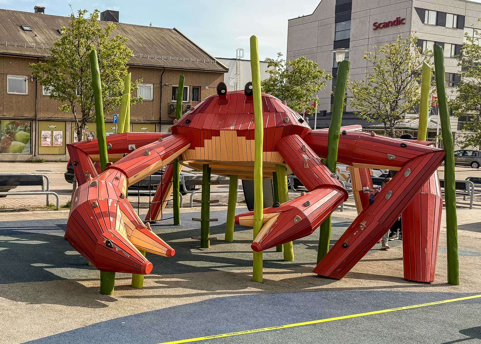 Scandic-hotellin edustan aukiolla sijaitsevaa jättimäistä lasten leikkeihin tarkoitettua kuningasrapua voi kuitenkin ihailla vuorokauden ajasta riippumatta. Vaikka yöllä, sillä kesäisinhän Kirkkoniemessä aurinko ei laske lainkaan. Sodan äidit -patsaan takia aukiota ei ehkä kannata hakea, mutta tuon ravun takia hyvinkin!