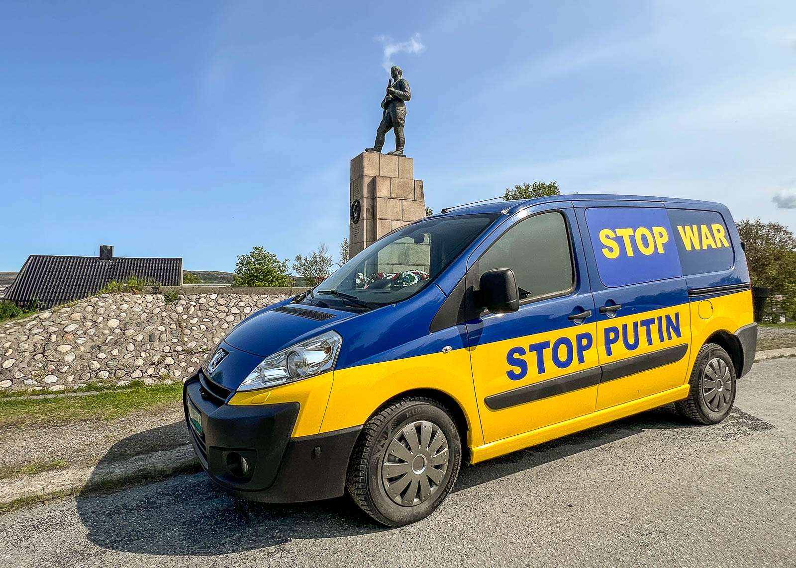 Juuri nyt kyllä muistomerkin viestiä hämärtää sen eteen ehkä melko pysyvästi pysäköity Ukrainan väreihin maalattua pakettiauto, jonka kylkiin on kirjoitettu Stop War – Stop Putin.
