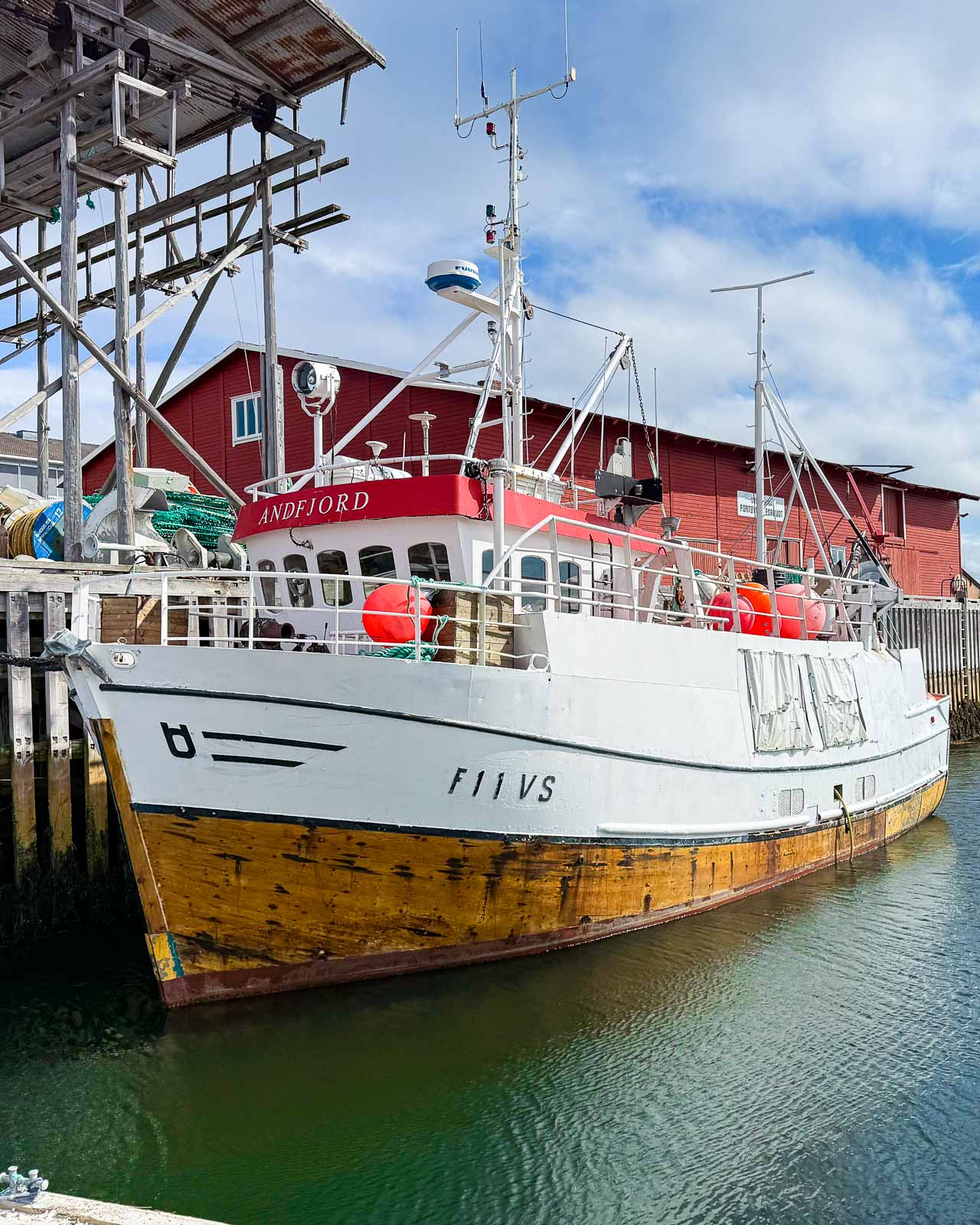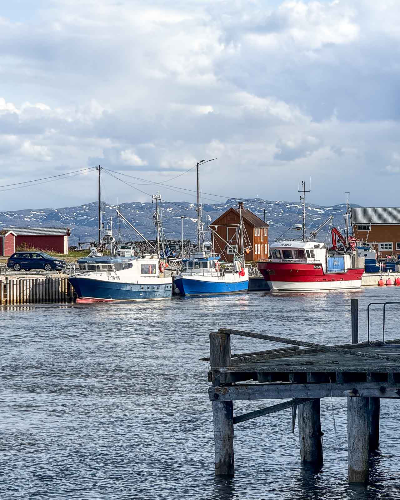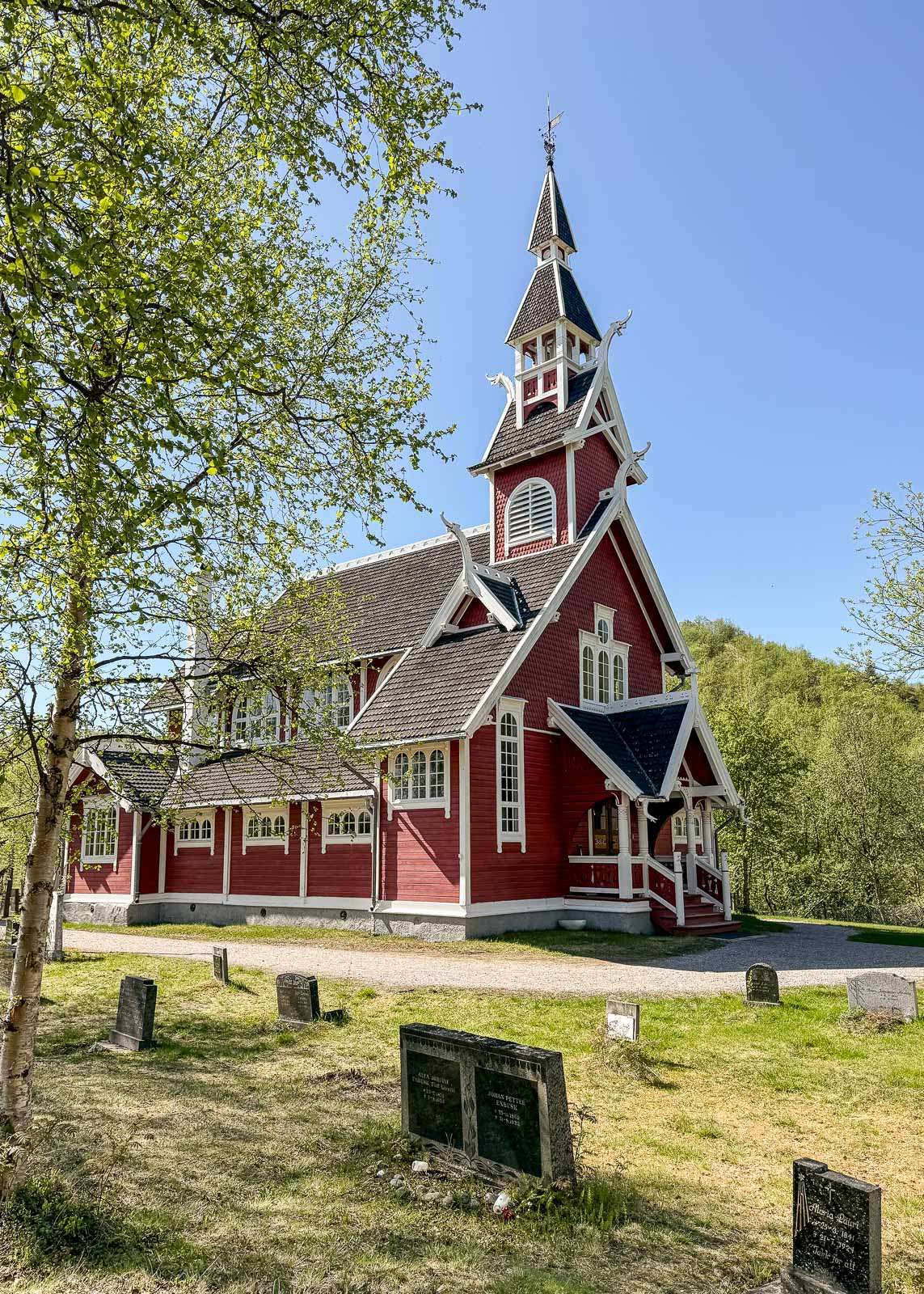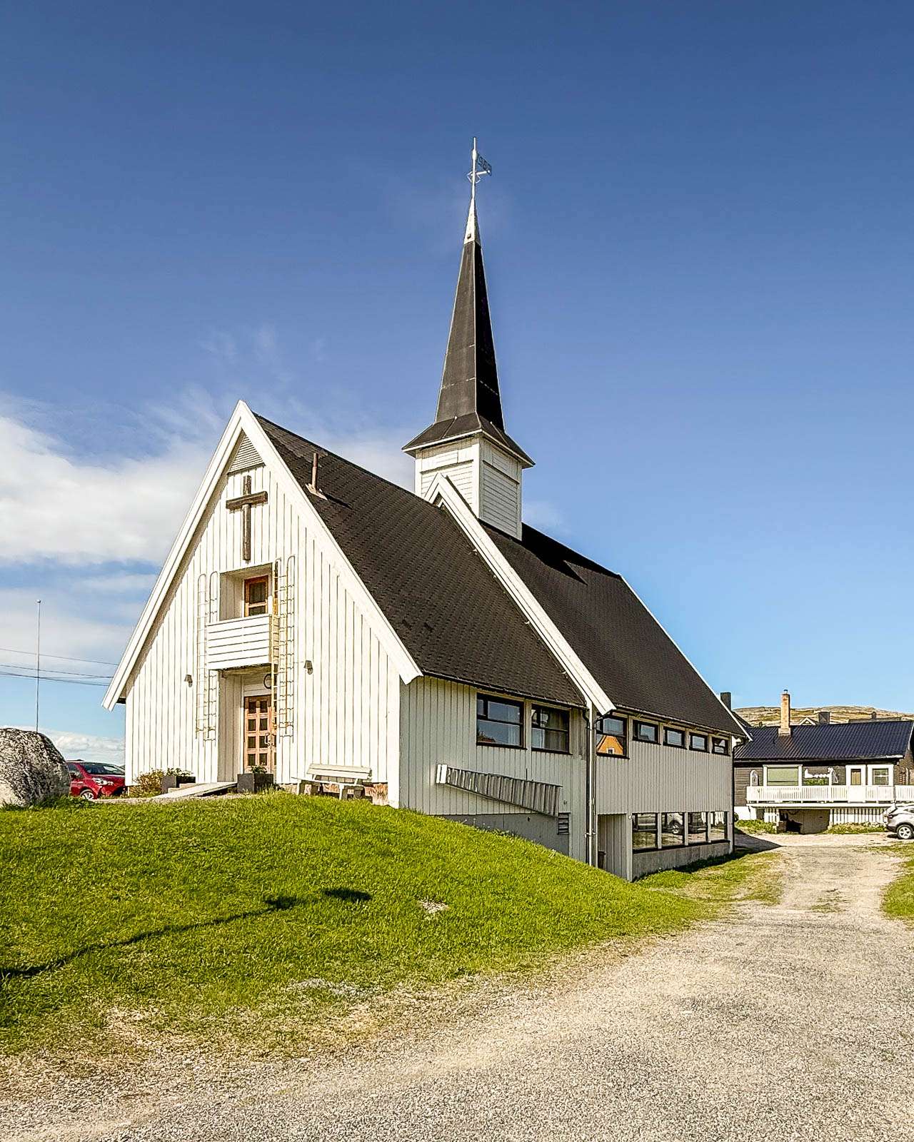 Neidenin kirkon ohella Kirkkoniemi – Vuoreija reitin varrella suositeltiin poikkemaan Nessebyn kirkolla – ja mehän teimme niin. Valkoinen puukirkko Varanginvuonoon tunkeutuvalla niemellä olikin kaunis. Onneksi poikkesimme E75-tieltä kirkon takia, sillä samaisella poikkeamalla näimme matkamme ensimmäisen kauniin värikkään kokoelman kalastajaveneitäkin.