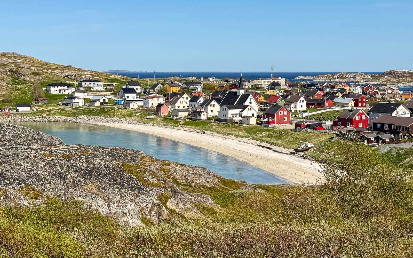 Pykeijan parhaat näkymät kannattaa taltioida muistiin tai kameraan jo ennen kylään laskeutumista. Valkoinen hiekkaranta, valkoinen kirkko ja pienet värikkäät talot muodostavat kauniin näkymän.