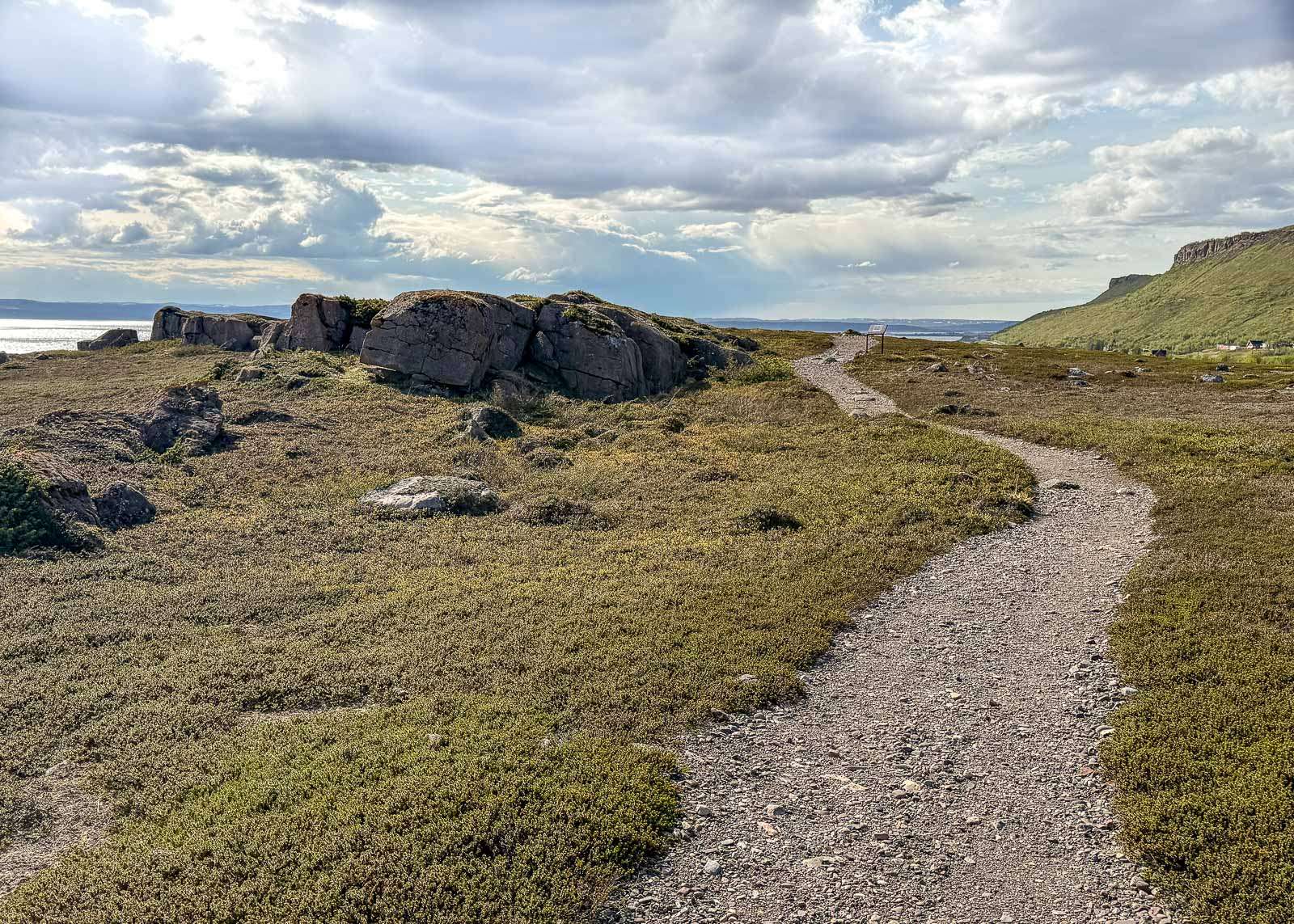 Me emme kuitenkaan siitä oikein innostuneet. Pieni museo oli suljettu tältä kaudelta – meille jäi epäselväksi, että joko kesän 2025 kausi meni eikö se kesäkuun alussa ollut vielä alkanutkaan. Ilman museota alue oli kokoelma melko huonosti merkittyjä polkuja kylmässä ulkoilmassa, etenkin tuulen tuivertaessa suoraan mereltä. Tärkeimmät muinaiset kivikokoelmat olisivat olleet aika kaukana, siis lähempänä rantaa, mutta emme innostuneet autiosta niemestä niin paljoa, että olisimme sinne asti viitsineet kävellä.