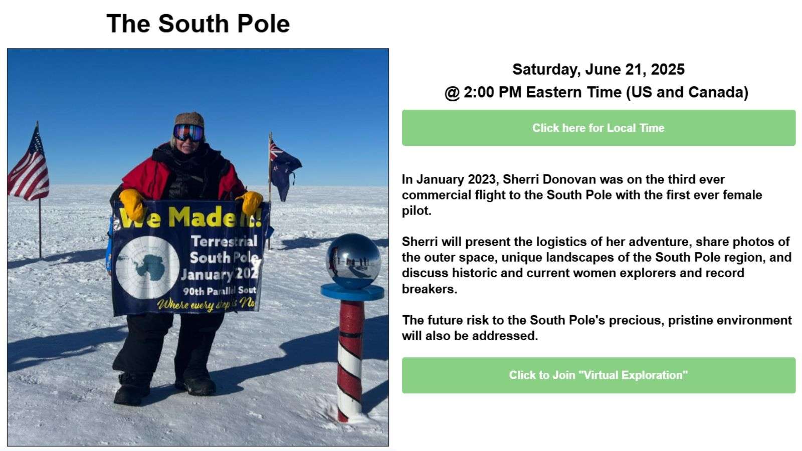 Itse matka alkoi Argentiina Punta Arenaksesta lennolla Union Glacierin leiriin, josta matkaa itse etelänavalle on vielä yli 1000 kilometriä. Lento Punta Arenaksesta Union Glacierin leiriin kesti 4 tuntia ja lento leiristä etelänavalle kestää 4-6 tuntia tuulista riippuen. Matkan pituus oli 5 vuorokautta Union Glacierin leirissä. Yhtenä päivänä käytiin lentäen etelänavalla. Matkaan oli varattu tuo 5 päivää siksi, että käynti etelänavalla voidaan toteuttaa vain hyvällä säällä, joten vajaa viikko leirissä lisää todennäköisyyttä sille, että matka onnistuu jonain näistä päivistä. Sherrilla ja hänen viidellä matkakumppanillaan oli onnea, sillä etelänavalla käytiin jo ensimmäisenä päivänä. Muina päivinä leiristä oli mahdollista tehdä erilaisia retkiä tai vaan hiihtää, kävellä tai pyöräillä leirin lähistöllä. Tarjolla oli myös erilaisia luentoja Antarktiseen liittyvistä aiheista.