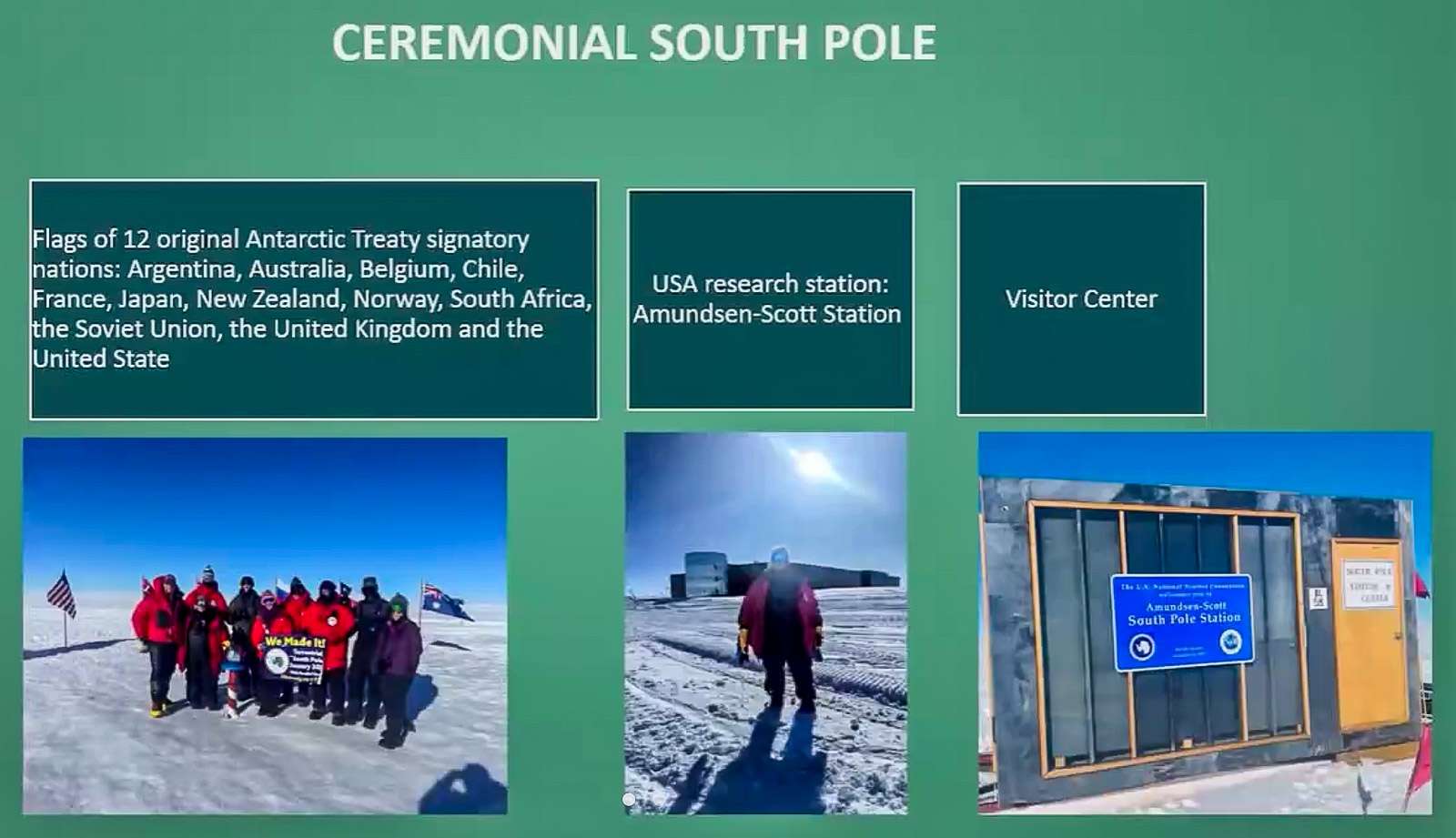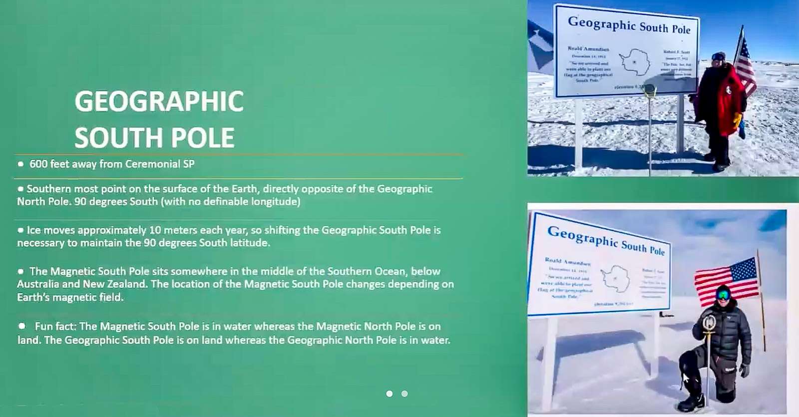 Ennen Sherrin esitystä en ollut ajatellut, että perillä, jos sinne asti päätyisi, onkin ei vaan yksi vaan kolme napaa. Maantieteellinen etelänapa on piste, jossa leveyspiiri on nolla ja pituuspiirit kohtaavat. Magneettinen etelänapa liikkuu jatkuvasti, eikä se tällä hetkellä ole edes Antarktiksen mantereella. Kolmantena Sherri mainitsee seremoniallisen etelänavan. Wikipedia listaa vielä pari muutakin.