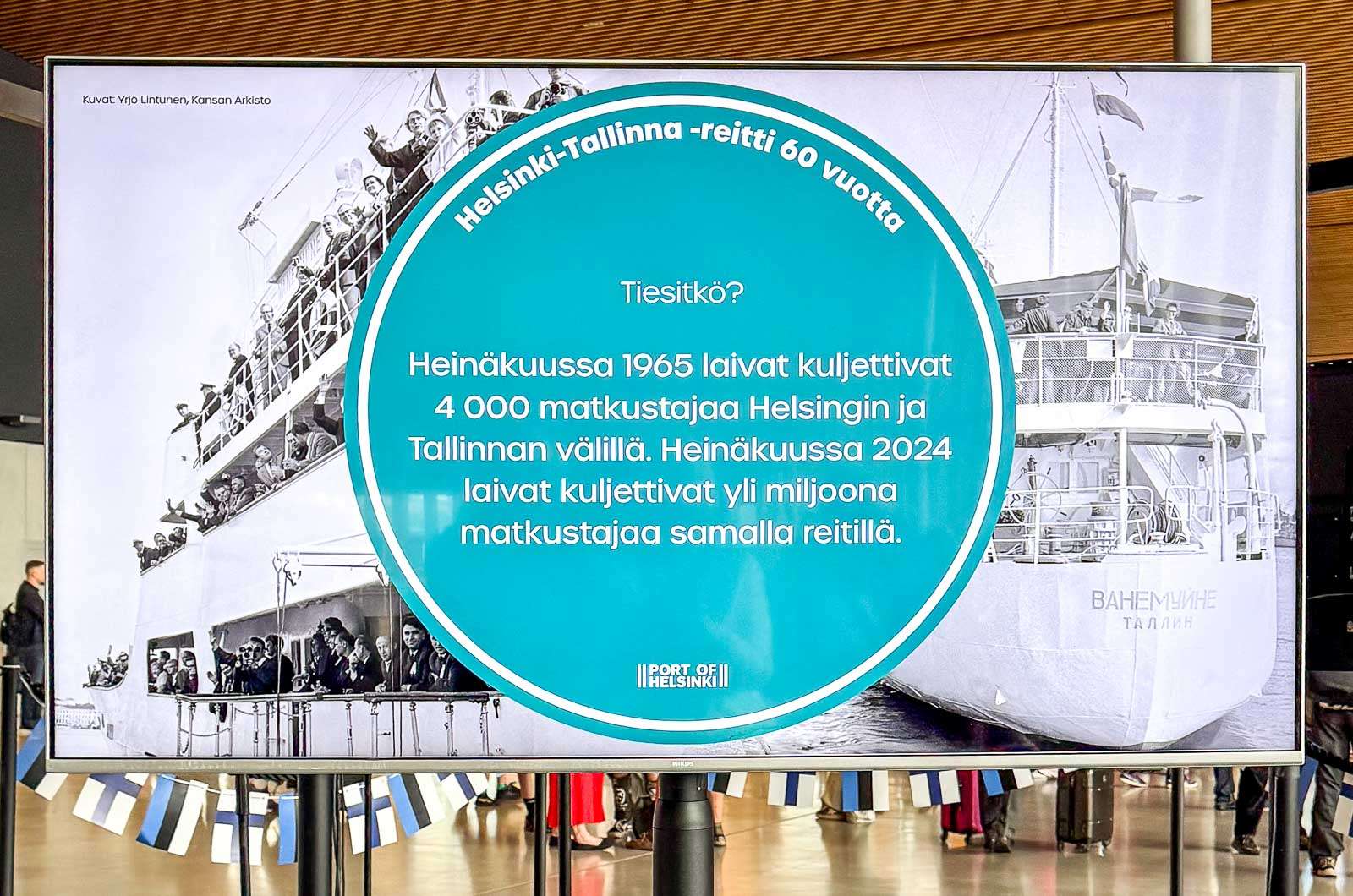 Olisimme, teoriassa, voineet matkustaa laivalla Tallinnaan jo 7.7.1965, sillä laivaliikenne tuolla välillä avautui uudelleen tauon jälkeen tuolloin, 60 vuotta sitten. Heinäkuun 7. päivänä vuonna 1965 m/s Vanemuine -laiva lähti Tallinnasta Helsinkiin. Maanantaisen matkamme teimmekin tuon 60-vuotisen historian kunniaksi, sillä saimme tilaisuuden osallistua Tallink Siljan juhlan tiimoilta järjestämälle vaikuttajamatkalle.