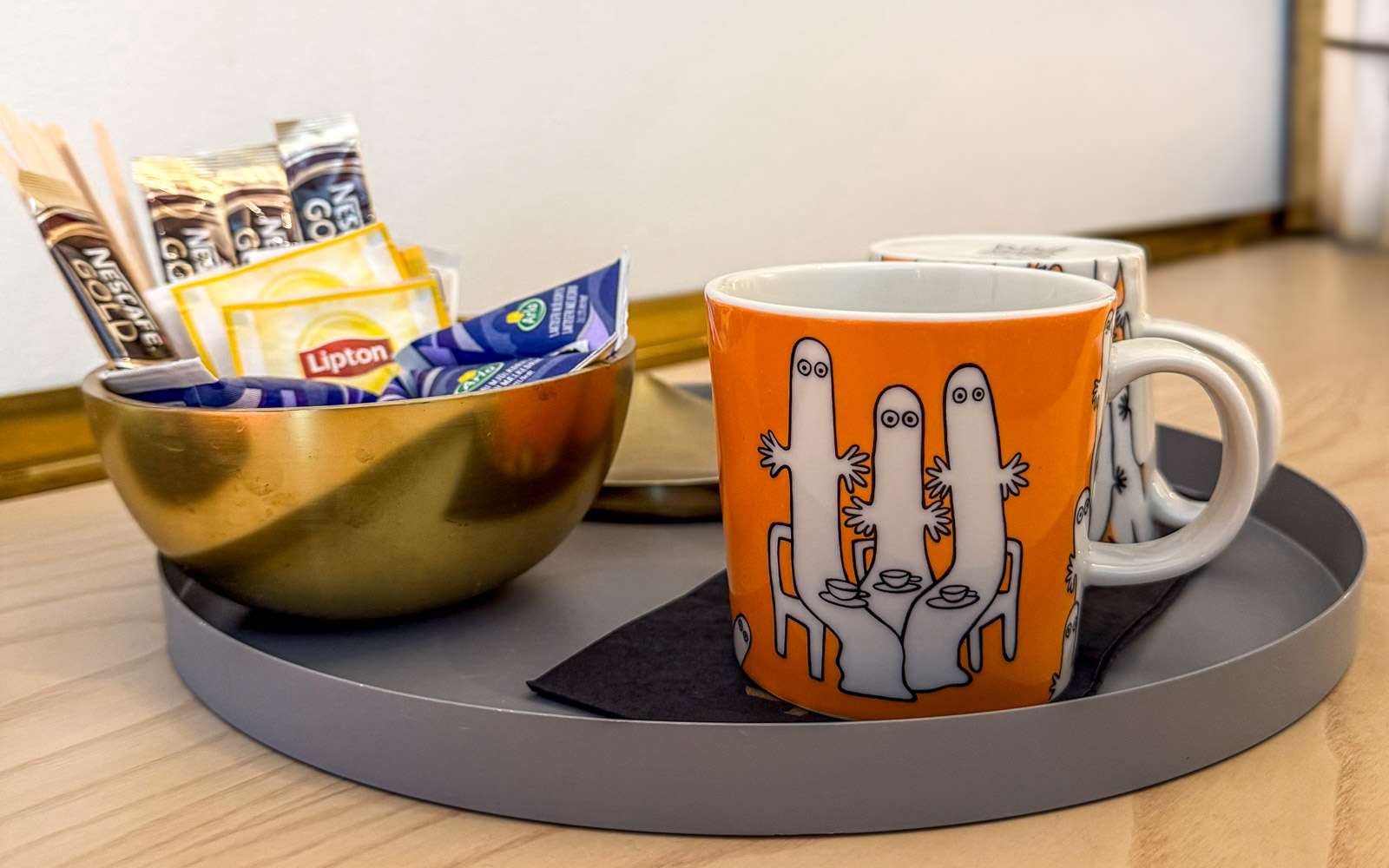 Ensiksi tietysti asetuimme taloksi. Huoneita on kuulemma kahta tyyppiä, selkeälinjaisia Sotamaa-huoneita ja värikkäitä ja moderneja KOKO3 -huoneita. Me päädyimme jälkimmäiseen ja ihastuimmekin huoneen kokoon ja skandinaavisen vaaleaan sisustukseen. Huoneen sisustuksessa, kuten ideansa mukaisesti kaikkialla Hanaholmen-hotellissa, ruotsalaiset ja suomalaiset asiat kulkevat käsi kädessä. Täälläkin värikkäät tekstiilit olivat Svenskt Tenniä (ruotsalainen “Marimekko” ja suomalaisuutta puolestaan edustivat muumimukit. Svenskt Tennistä muuten lisää, jos sattuisi kiinnostamaan, jutussa joulukuiselta retkeltämme Svenskt Tenn -näyttelyyn Tukholmassa.