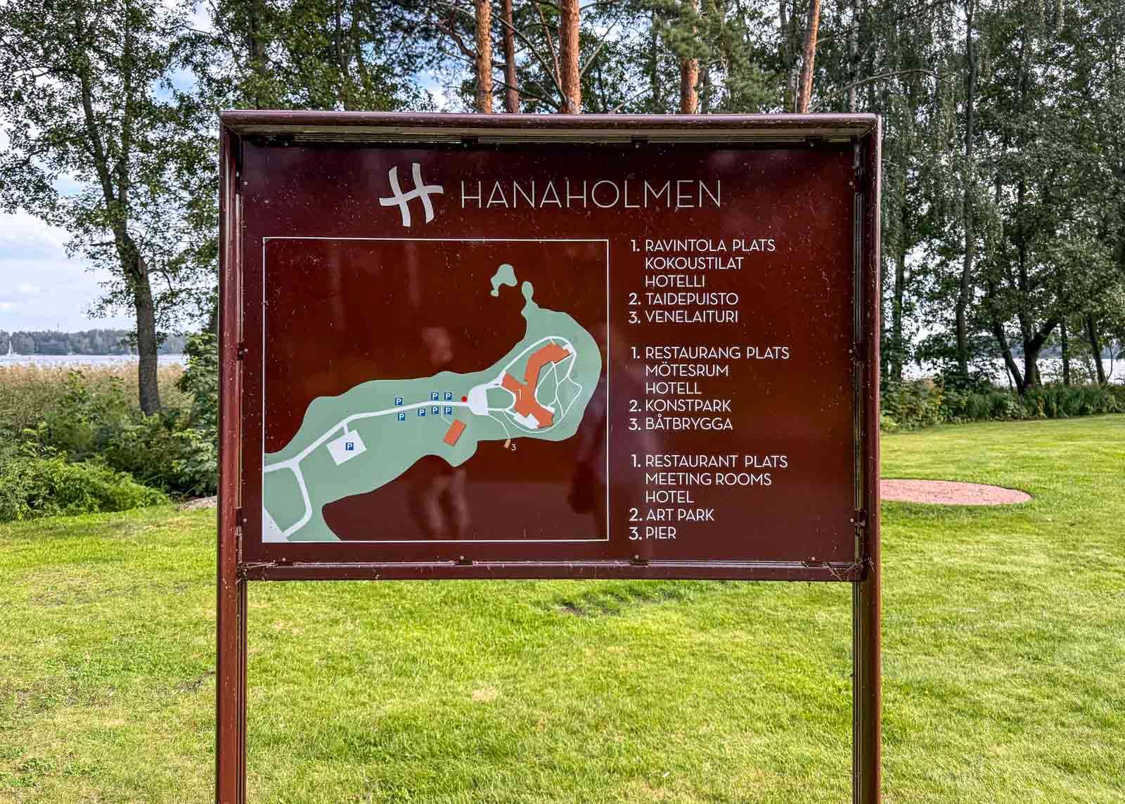 Hanaholmen on myös taidetta. Hotellin ja konferenssikeskuksen tiloissa on n. 300 teosta, joista monet ovat Ruotsin valtion lahjoittamia. Mm. jokaisen hotellihuoneen seinällä on alkuperäistä taidetta. Nyttemmin taide on levinnyt myös ympäröivään luontoon useamman teoksen muodossa. Sisätilojen teoksista taidekäytävä oli meillekin ihan uusi asia vaikka puiston teoksia olimme nähneet aikaisemminkin.