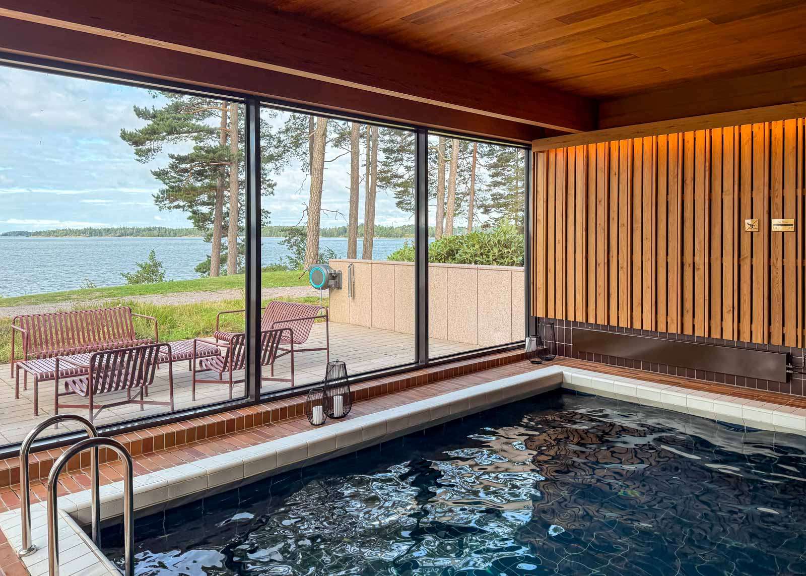 Pistäytyminen meressäkin olisi onnistunut, sillä uima-altaalta on vain lyhyt matka rantasaunalle ja sen laiturille, mutta elokuinen aamu oli jo sen verran kolea, että tyydyimme altaan luultavasti vähän lämpöisempään veteen.