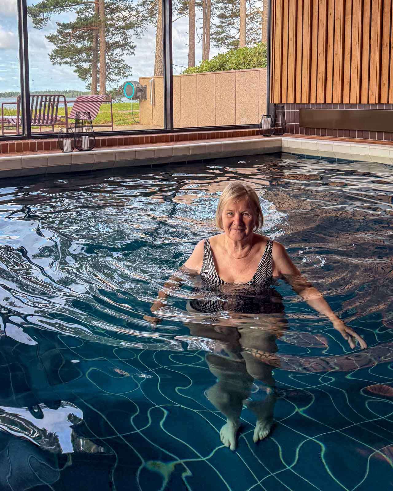 Vaikka Hanaholmen olikin meille jossain määrin tuttu entuudestaan, niin emme olleet koskaan ennen yöpyneet siellä ja sen myötä olimme nähneet hotellin sauna- ja uima-allasosaston vain kuvissa. Uima-allas on hotellivieraiden käytössä aina aamuisin, mutta hyvällä tuurilla, ellei sitä ole varattu yksityistilaisuuteen, myös iltauinti ja -sauna voi onnistua. Niin olisi ollut meidänkin Hanaholmen-hotellissa yöpyessämme, mutta valitsimme virkistävän aamu-uinnin 70-luvun tunnelmaa huokuvassa, mutta hyväkuntoisessa ympäristössä.